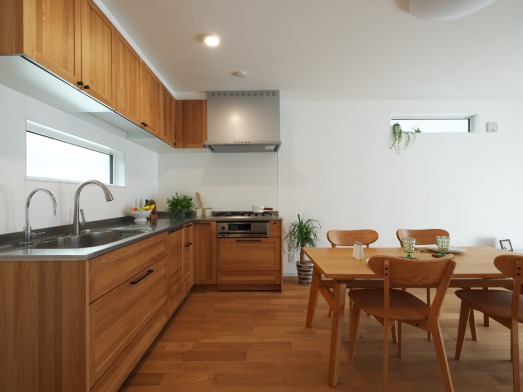 対面型のキッチンが主流となっている昨今ですが、木製キッチンが綺麗にいつでも見られるのが、この壁付けキッチンの大きな魅力。