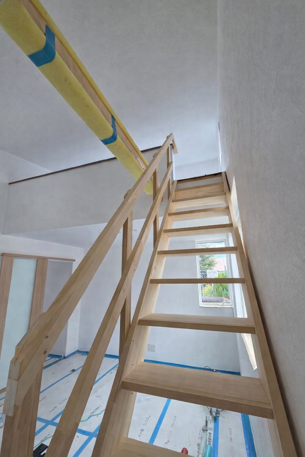今回のお住まいでは、ロフトへとつながる階段の設置も行いました。限られた空間を有効活用できるロフトは、収納スペースとしてはもちろん、趣味のスペースやくつろぎの場としても活用できる人気のプランです。そのロフトへ上がる階段は大工さんによる丁寧な施工で取り付けられ、安全性と使いやすさの両立を意識しています。