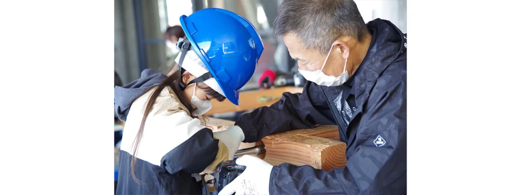 上棟体験では木製ハンマーと電動工具を使い、簡単な木製の小屋を組み上げます。はじめての電動工具に「ネジが本当に回っているか不安だったけれど、工具から伝わる手ごたえで締まったことがわかりました。思ったより重たかったです」と、素直な感想も。「いま、まさに新しい体験をしている」手応えがこちらにも伝わってきて、嬉しくなりました。
