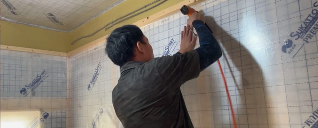 壁の内側にシートを張り、断熱材が逃げないようにします。