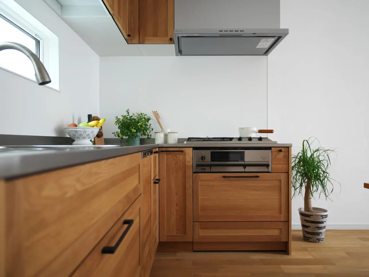 対面型のキッチンが主流となっている昨今ですが、木製キッチンが綺麗にいつでも見られるのが、この壁付けキッチンの大きな魅力。