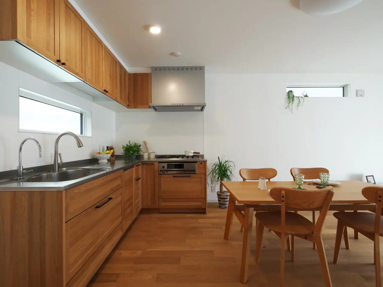 床の色ともまたよく馴染むwoodoneの木製キッチンsuijiを採用。