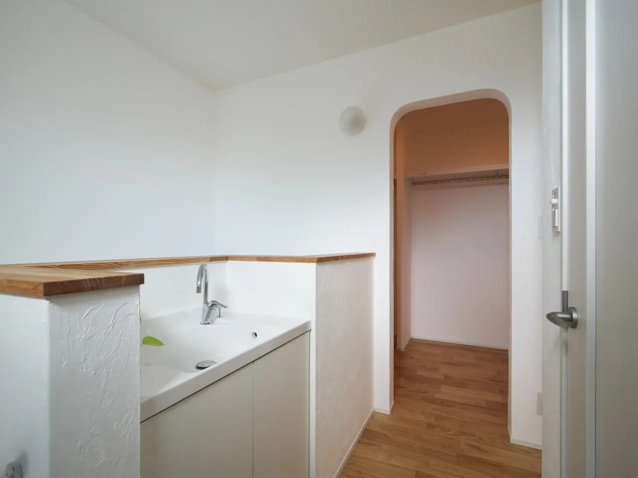 ウォークインクローゼットには、玄関やパントリーでも姿を見せてくれたアーチの壁で造作。