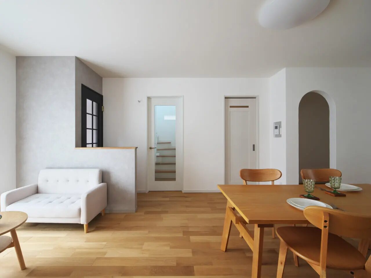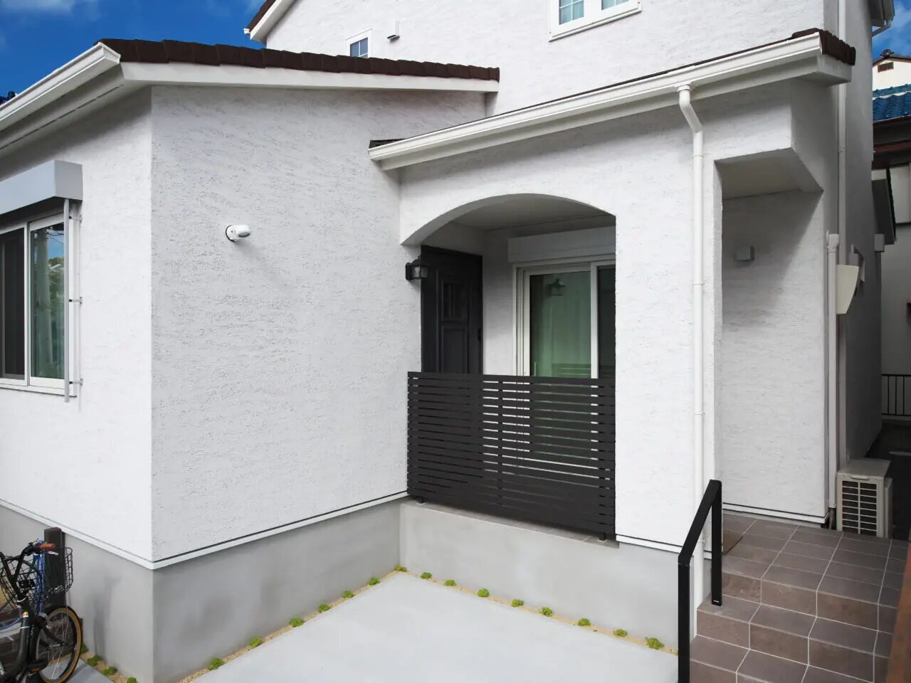 交野市の注文住宅|アーチの玄関が迎えてくれるそとん壁の家|造作家具と木製キッチンsuiji アイキャッチ