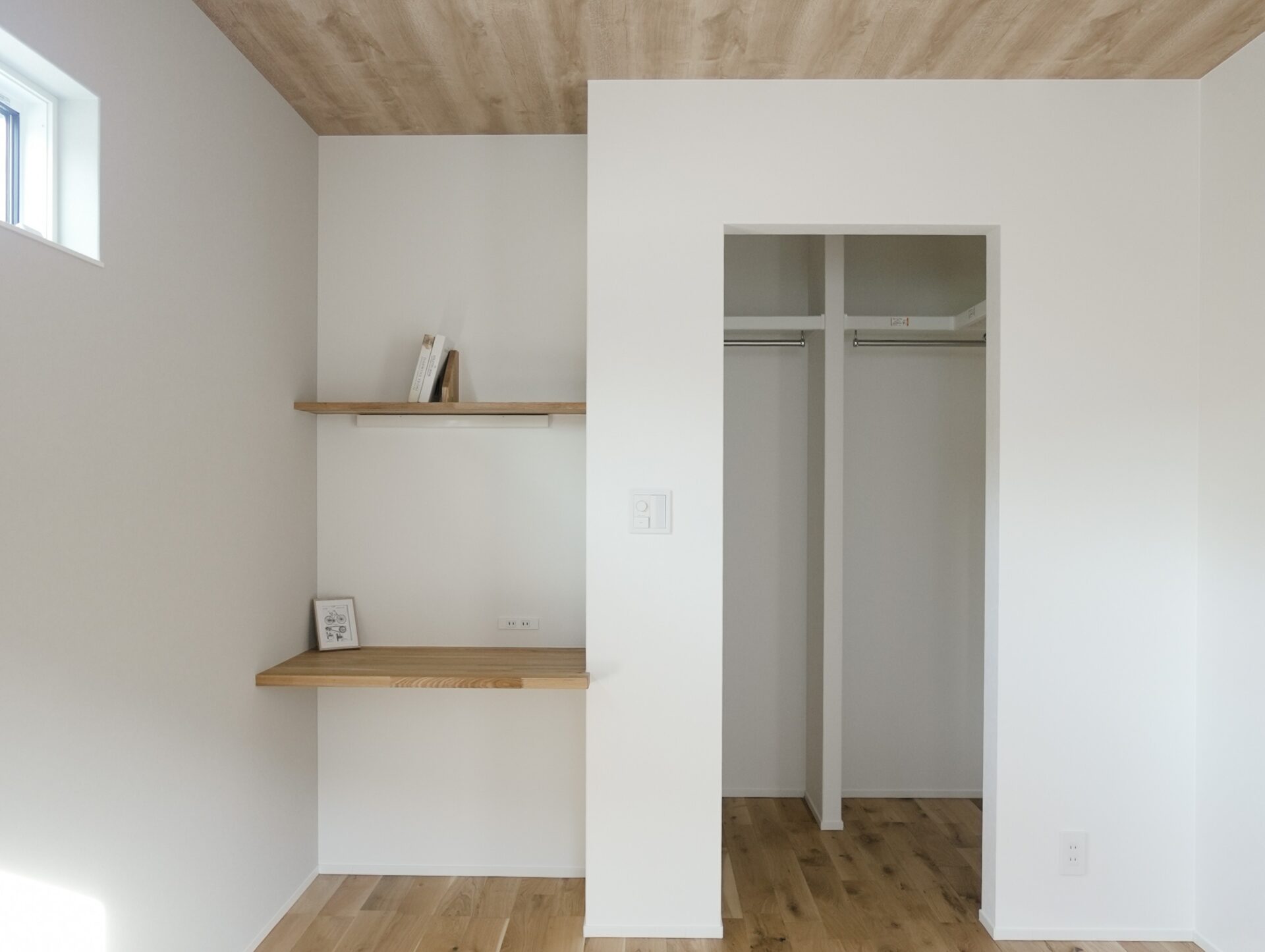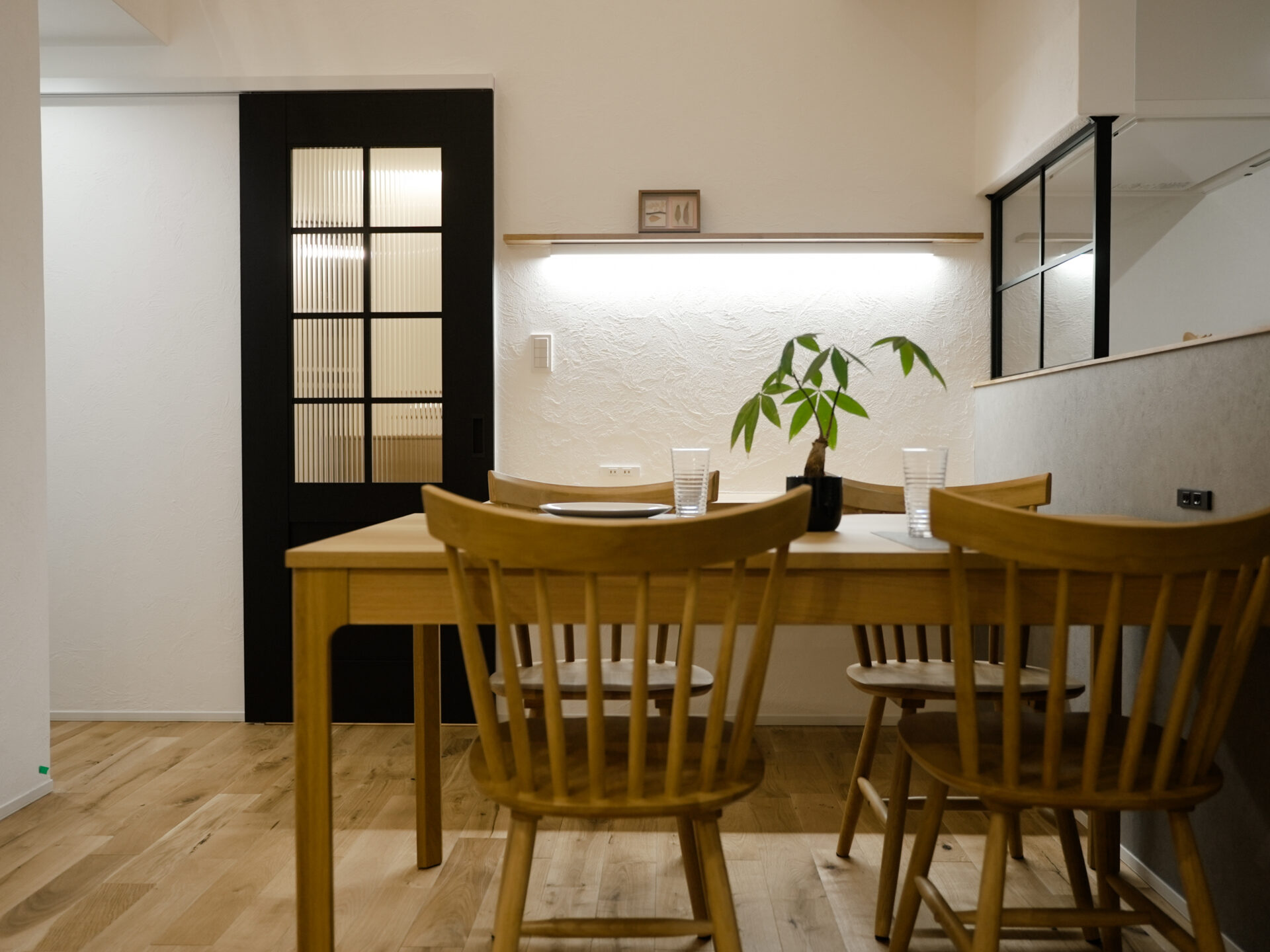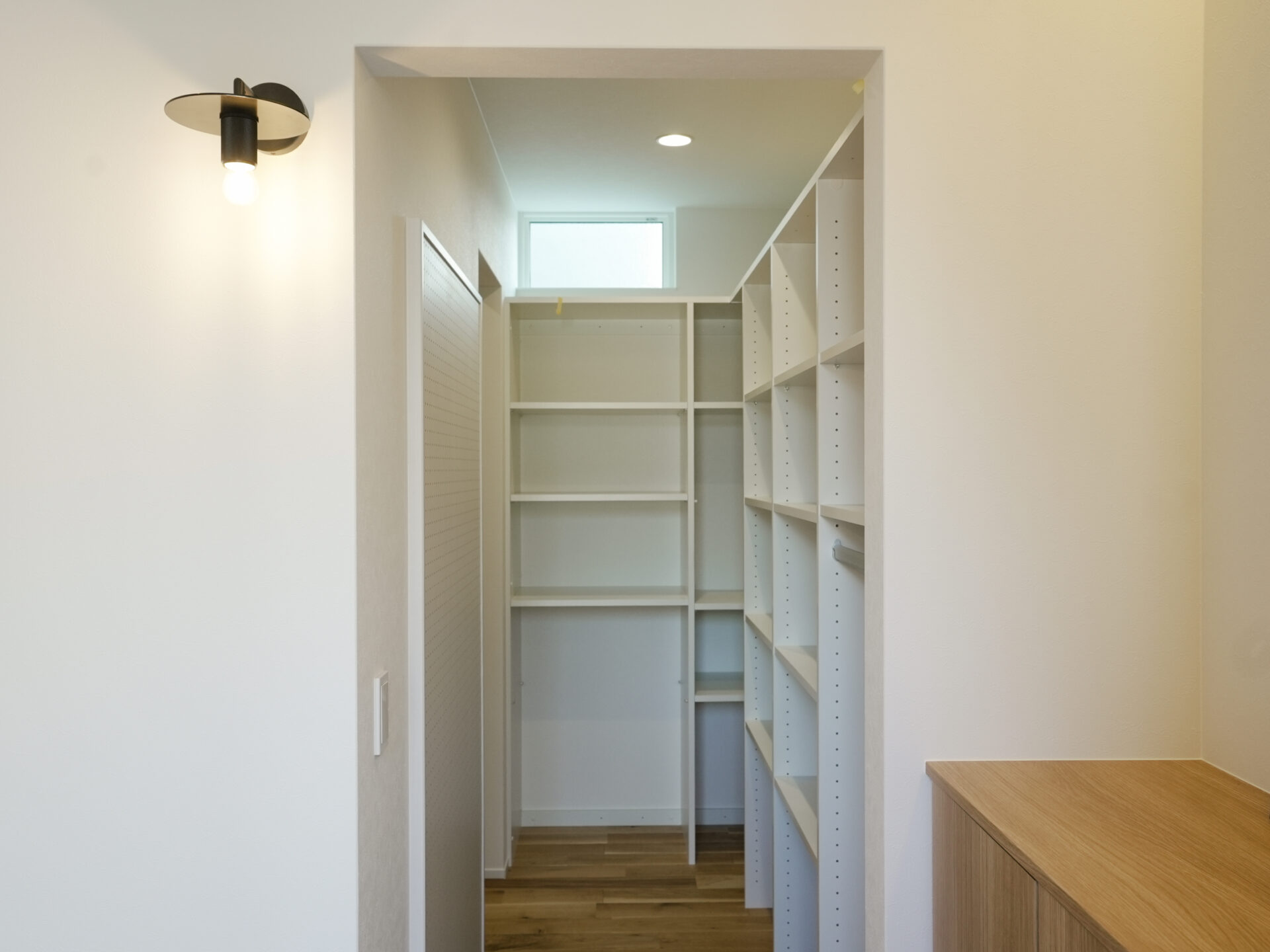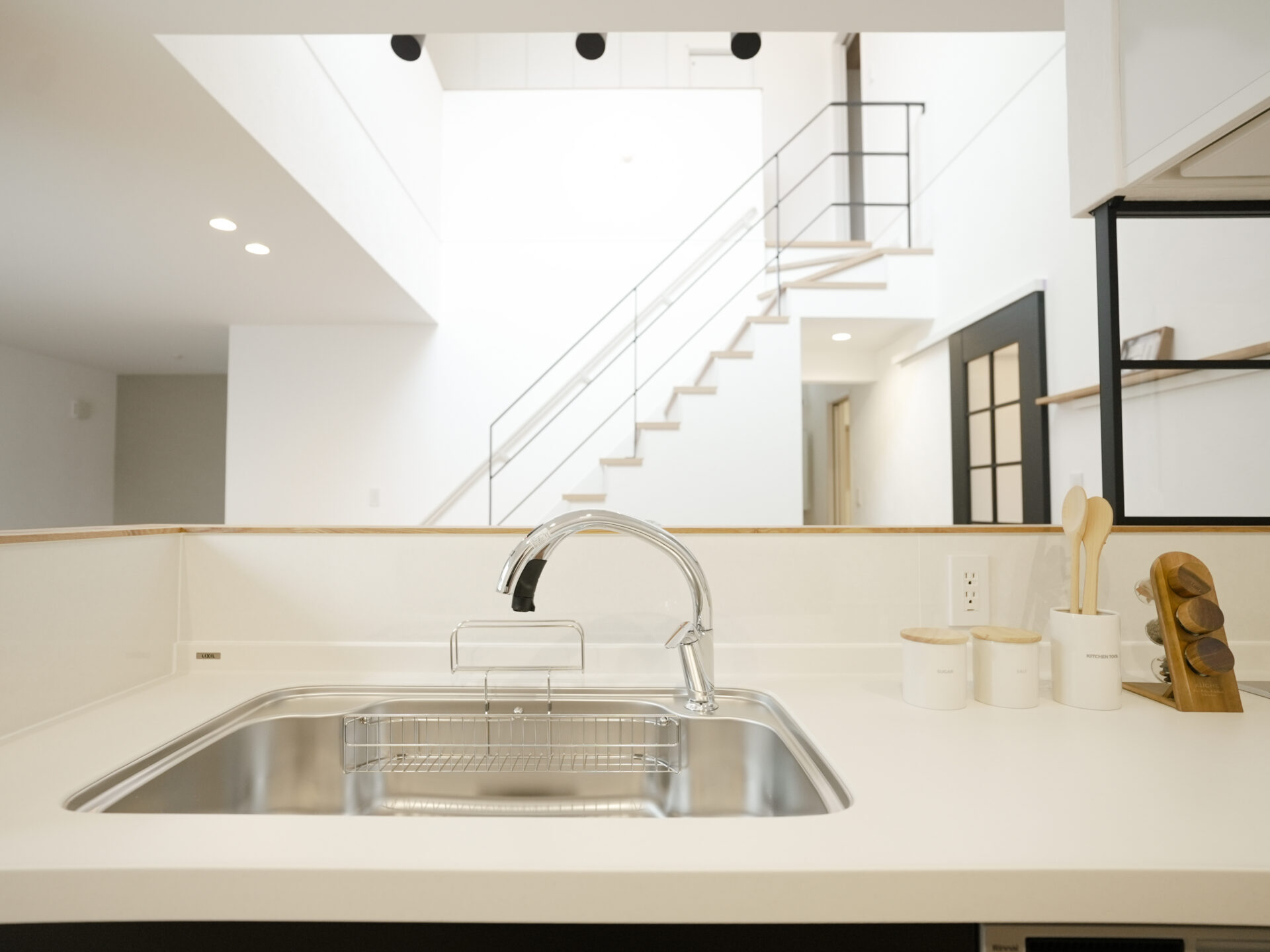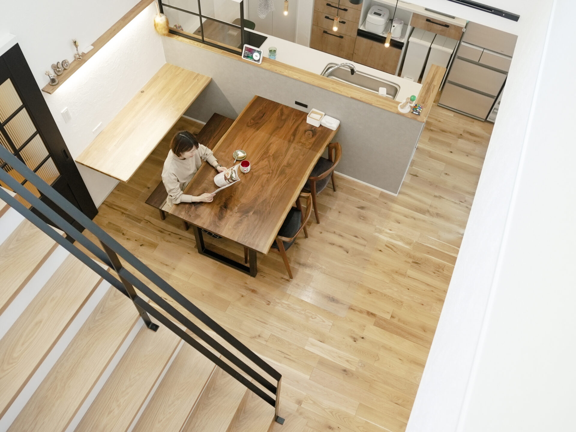 家族用と来客用を分けた二つの玄関で、暮らしやすさとおもてなしを両立しました。室内は自然素材を基調に、漆喰塗の壁がやわらかな空気をつくります。吹き抜けから光が差し込む、開放感ある住まいです。