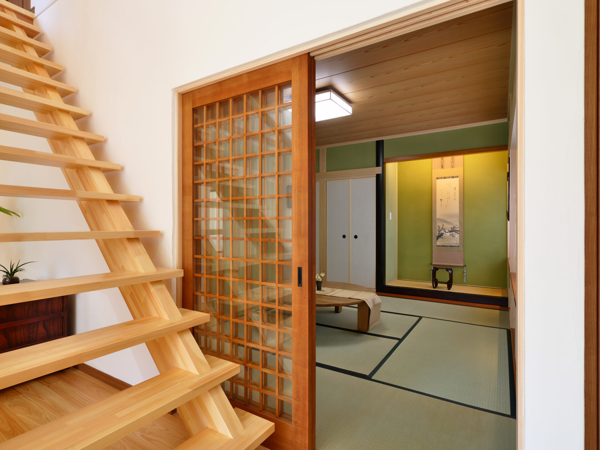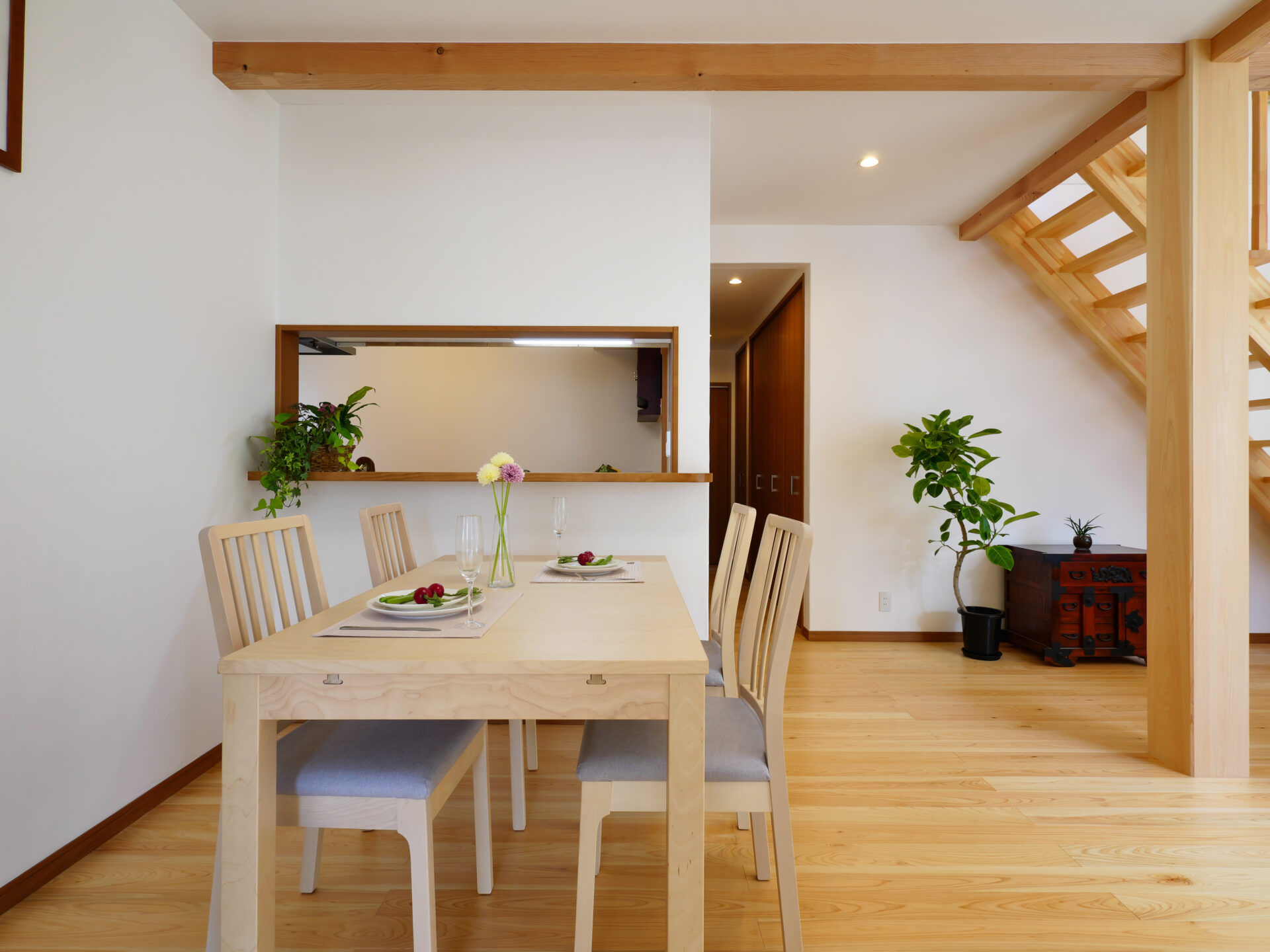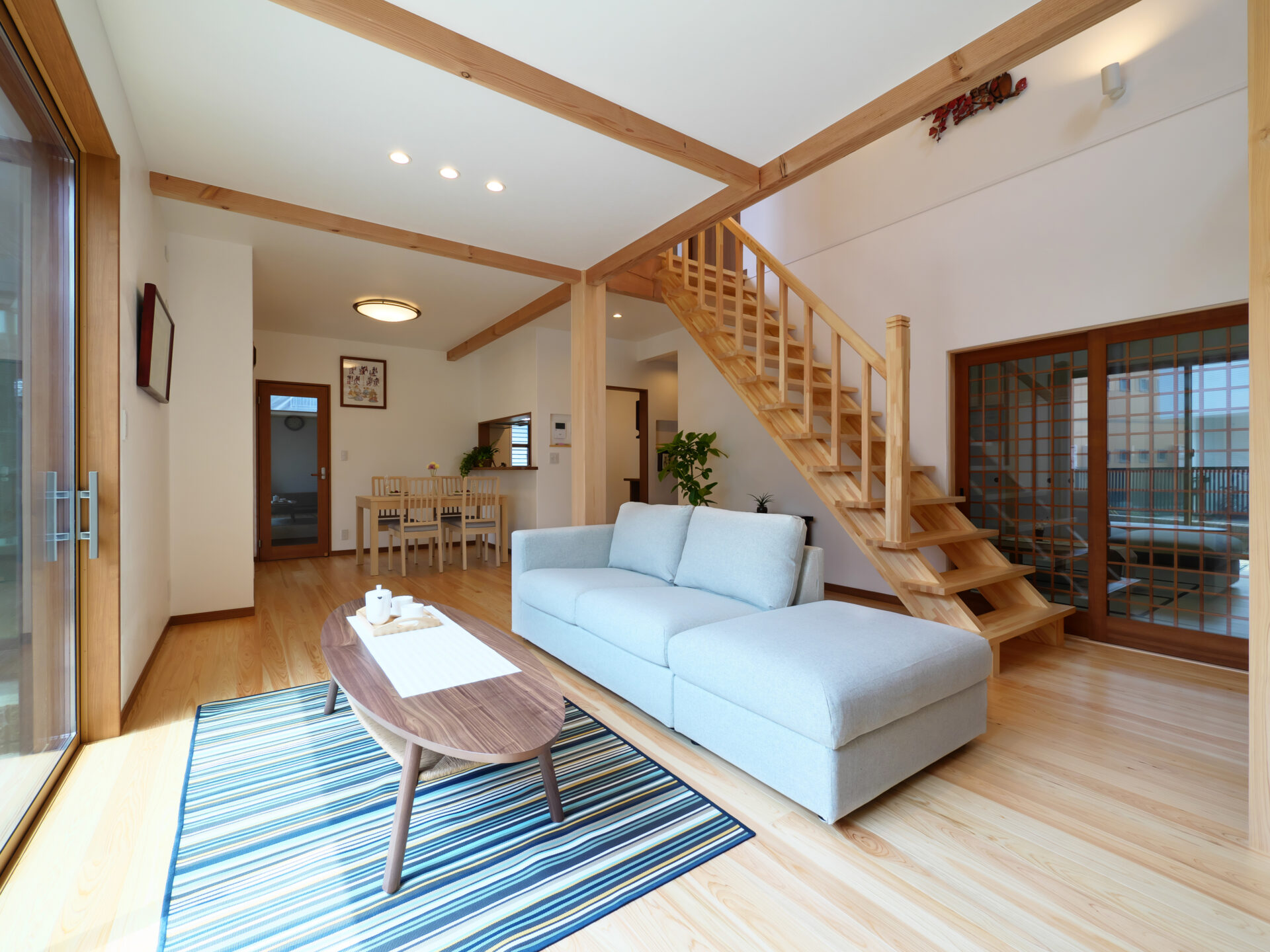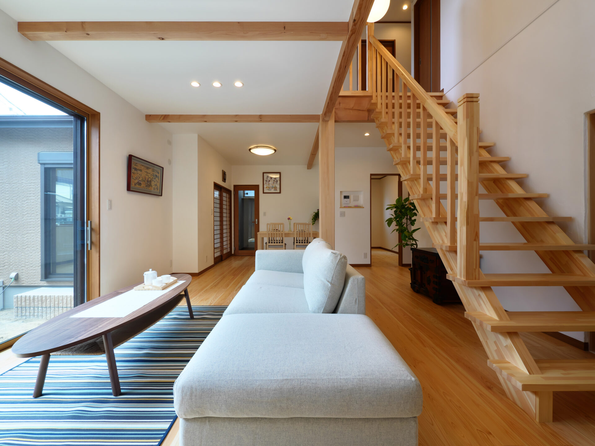 摂津市の注文住宅|木の温もりを感じる住まい|造作階段と梁見せ天井、和室のある愛猫家住宅