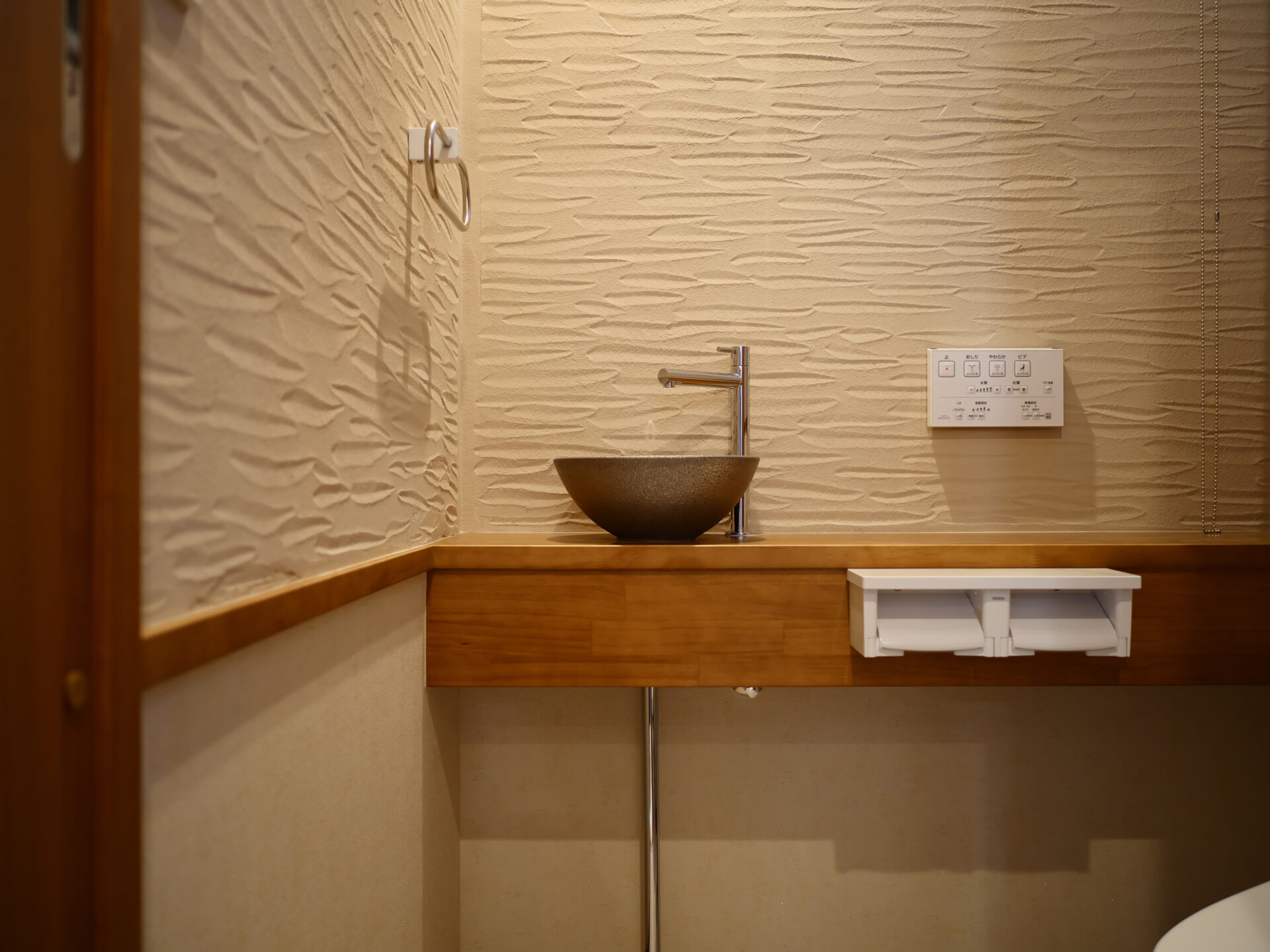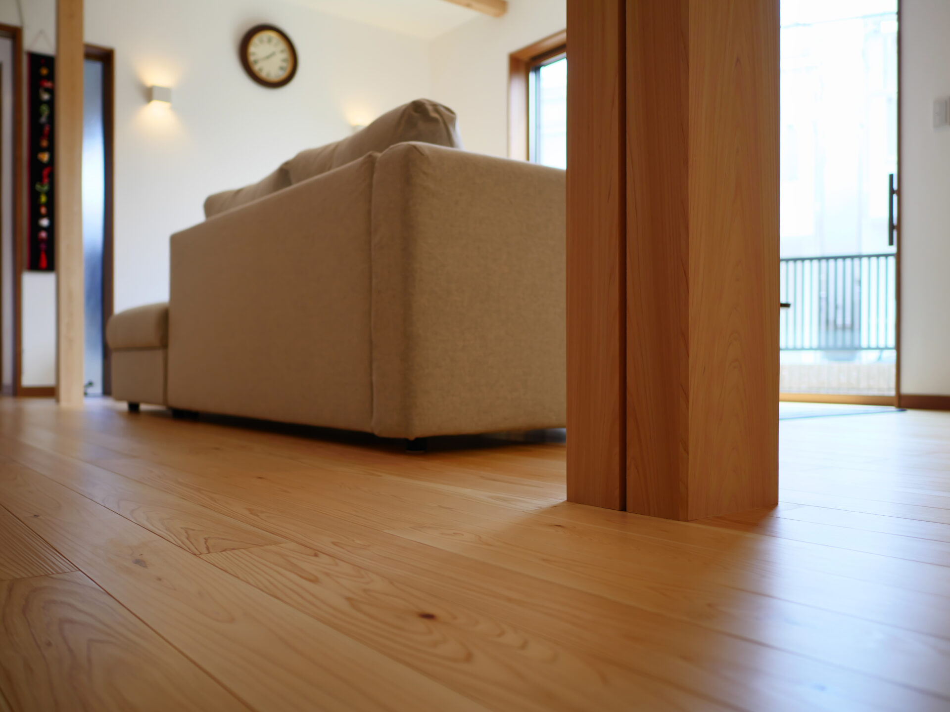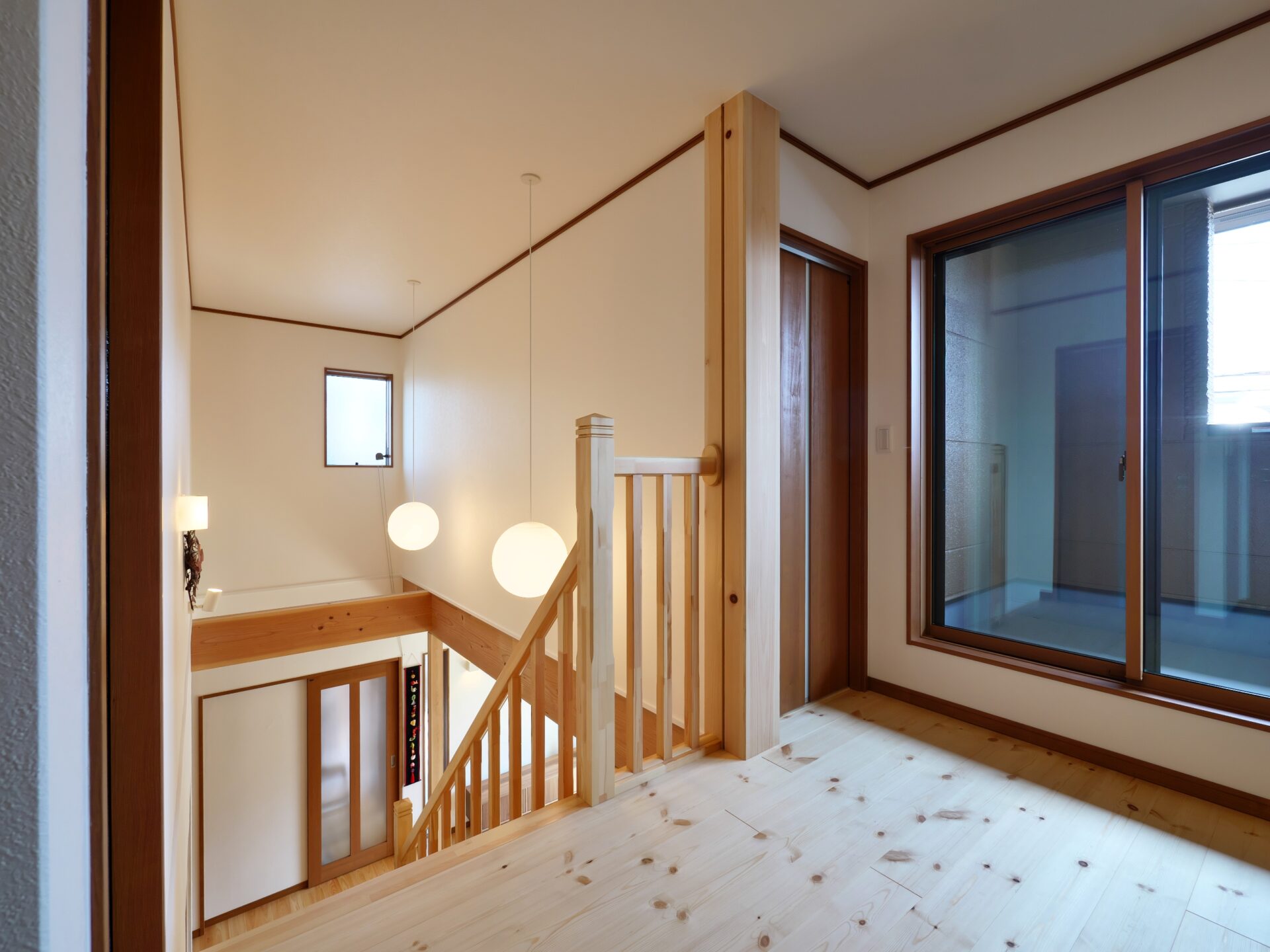 摂津市に建つ、木の温もりを感じる注文住宅。職人が丁寧に仕上げた木製の造作階段を中心に、梁を見せた天井が空間に開放感と木の存在感を与えます。落ち着いた和室も備え、家族がくつろげる居場所を確保。素材の質感を大切にした、心地よく暮らせる住まいです。