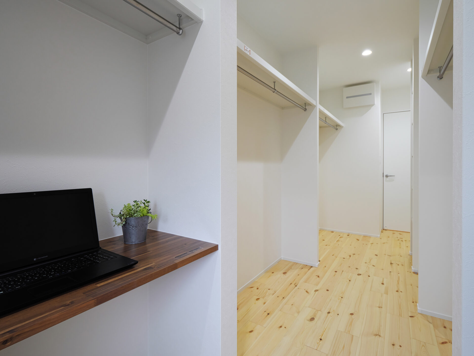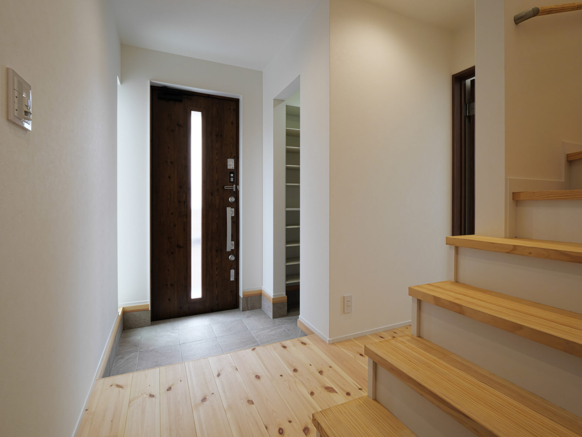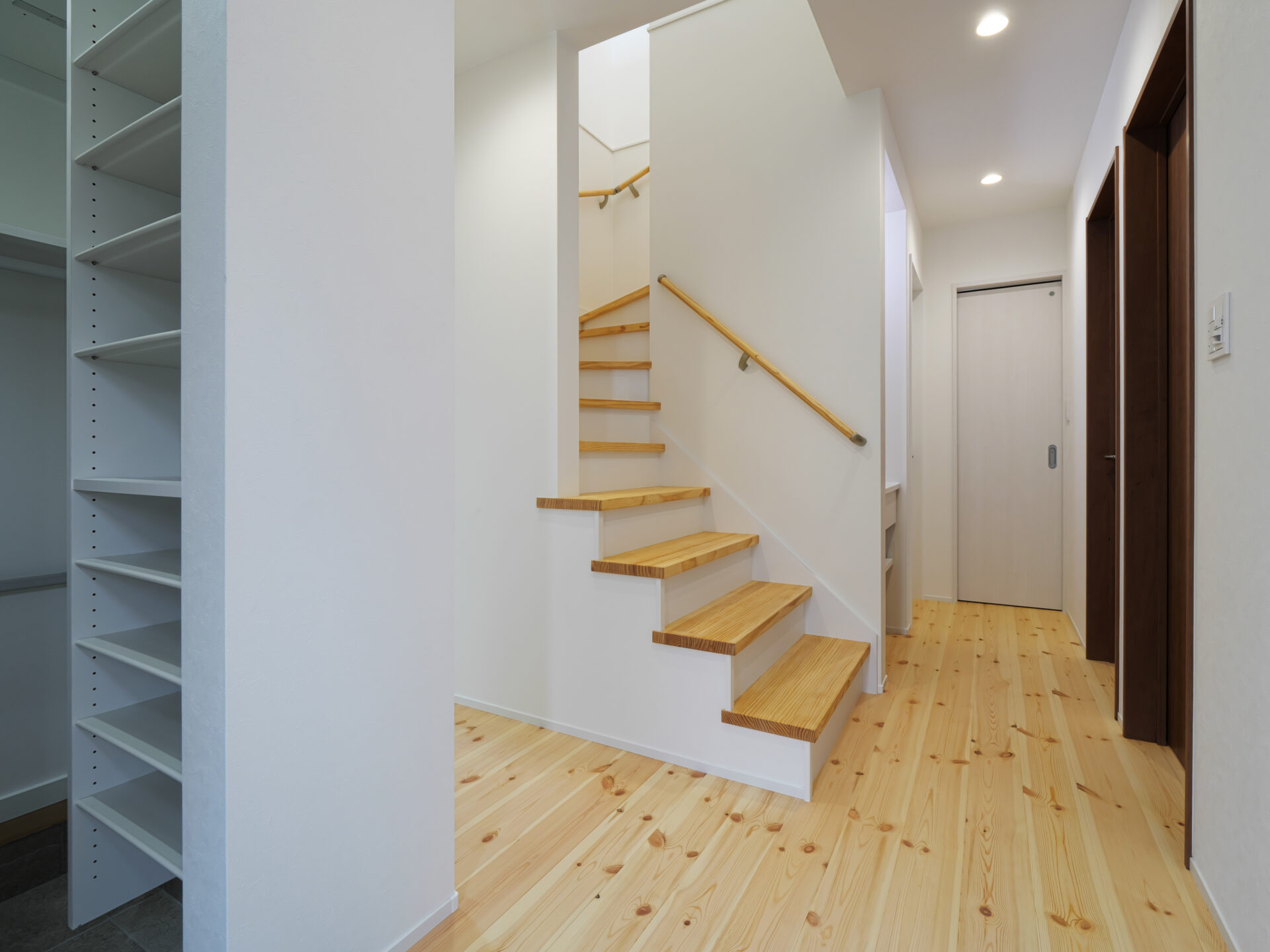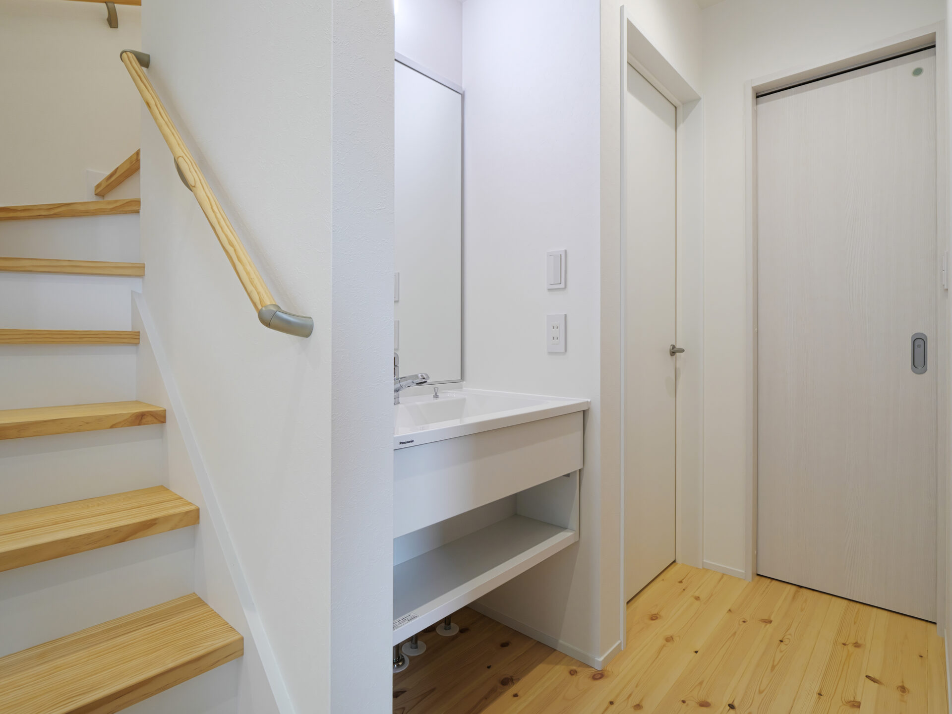 茨木市に建つバルコニーのアウトドアリビングを楽しむ家で、無垢パインの床と勾配天井により開放感ある空間を実現しています。限られた敷地を有効活用し一部をビルトインガレージに設計、玄関から奥行を感じる間取りに。玄関横に手洗いを配置し、ワークスペースや和室など多目的に使える空間も確保。2階リビングは勾配天井で広さを感じられ、家族がのびのび過ごせる工夫が随所にあります。