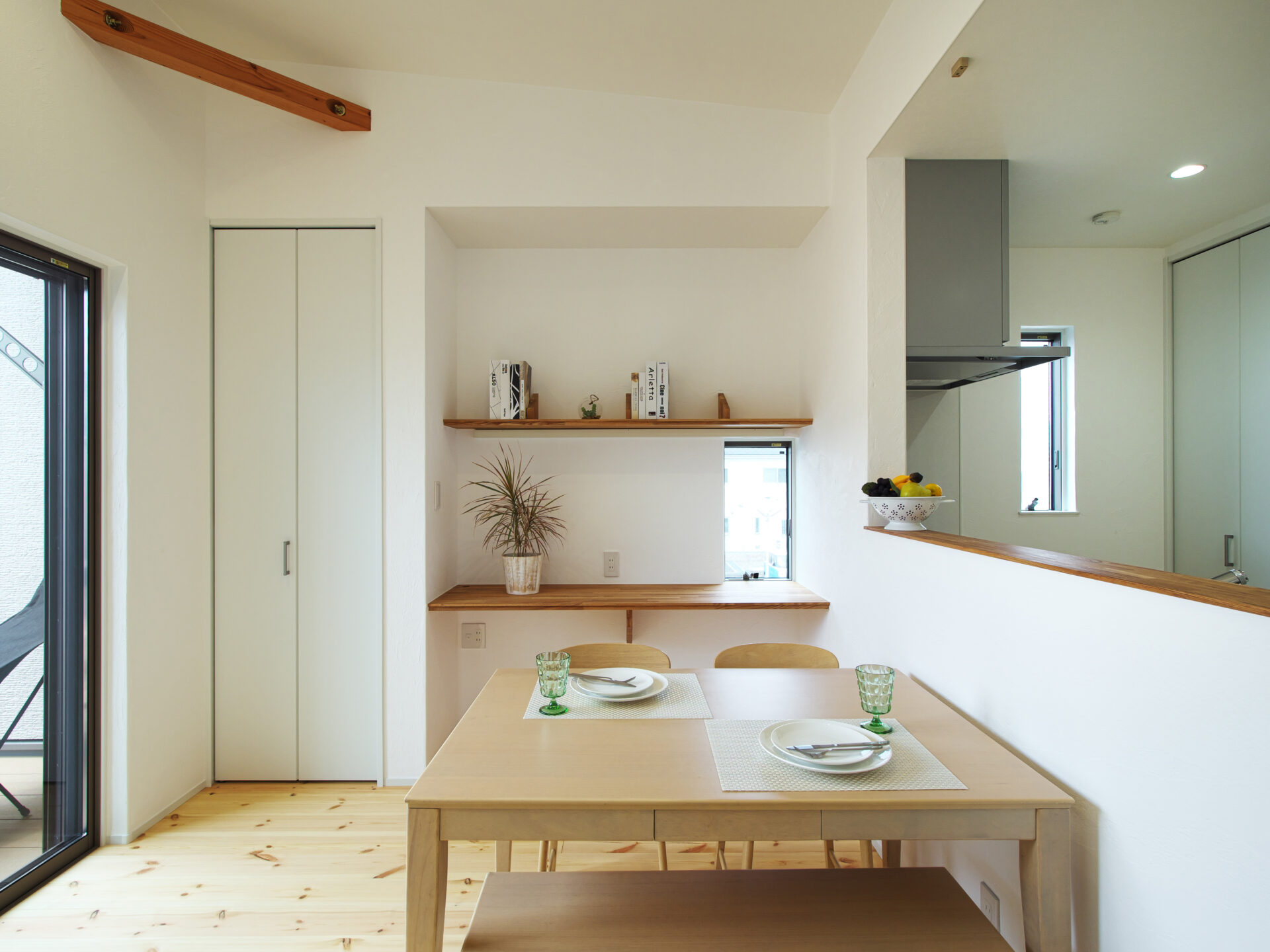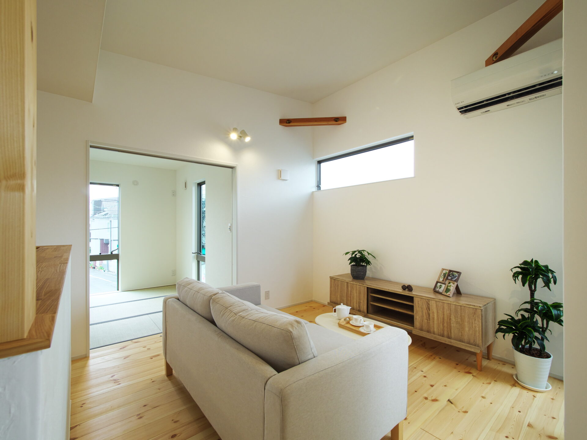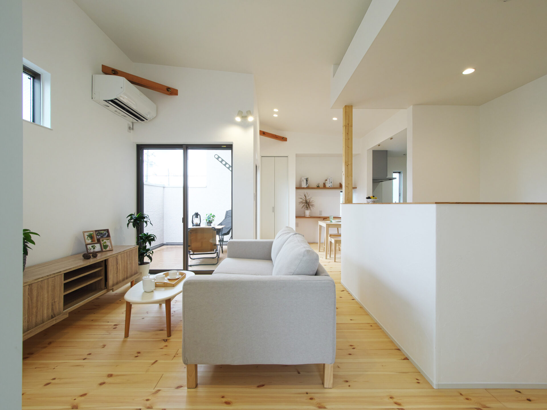 茨木市の注文住宅|バルコニーのアウトドアリビングを手に入れた家|無垢パインの床と勾配天井