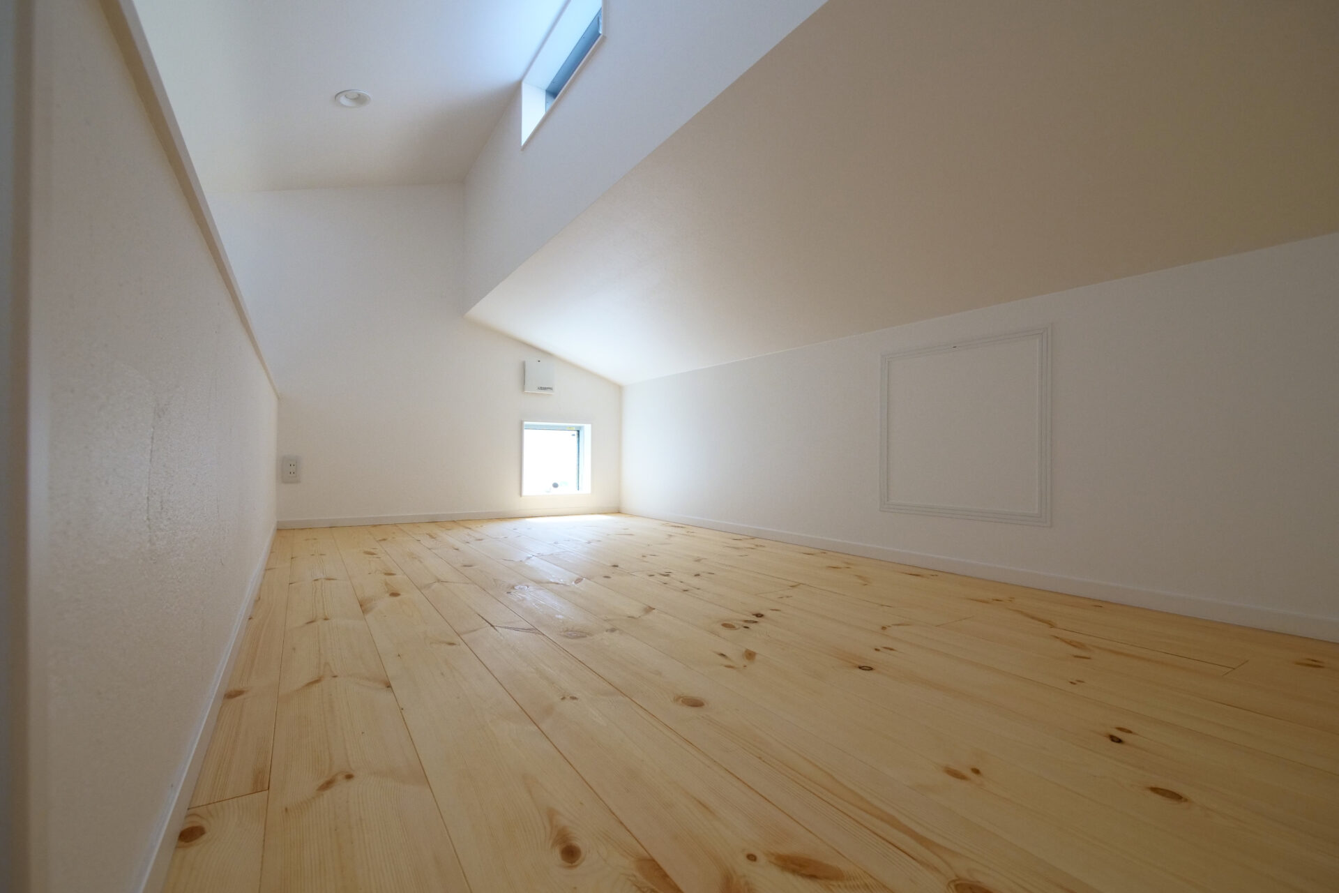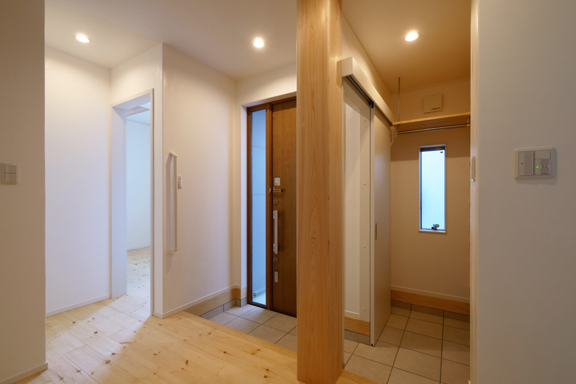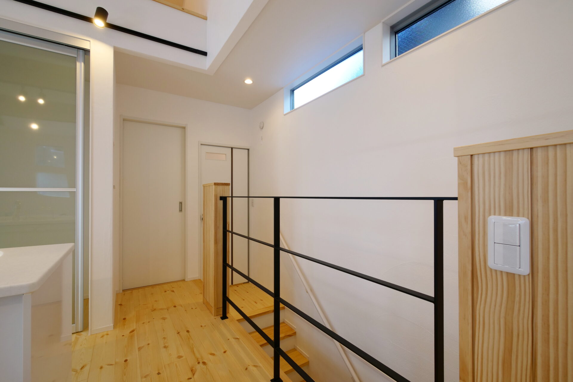 茨木市で計画したこの住まいは、2階リビングと勾配天井によって光と広がりを確保した注文住宅です。限られた敷地条件の中でも、フルフラットキッチンを中心にLDK全体を見渡せる配置とし、家族のつながりを感じられる空間構成としています。玄関から続くオープン階段が視線を遮らず、住まいに一体感をもたらします。しっくい仕上げの洗面脱衣室DIYを楽しめるスペースなど、暮らしを楽しむ工夫を随所に盛り込んだ住まいです。