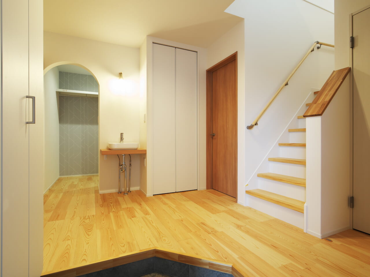 玄関を開けると広がるのは、圧迫感の無いよう視線が抜けるよう作られたゆったりめのホール空間。使いやすさとデザイン性でナナメに作られた玄関框、帰宅後すぐに手を洗うことのできる水栓ボウルとライティング、クローゼットのアーチ壁。カッコいい外観とはうってかわって、毎日の憩いのために柔らかく優しいデザインが広がります。