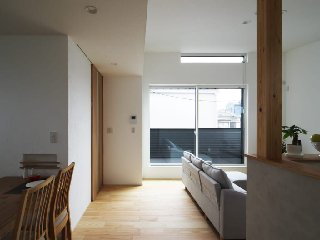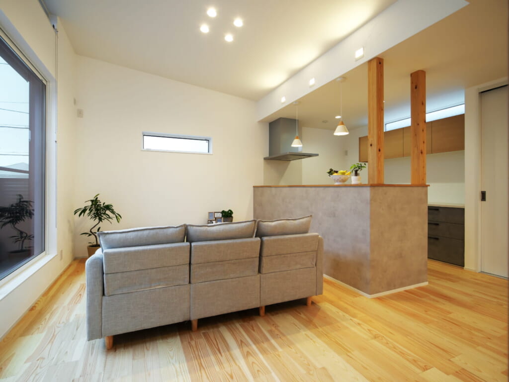 2階リビングの空間には自然素材の漆喰壁、無垢床を採用。長持ちや調湿性、アレルギー対策など、自然素材には多くのメリットがありますが、この写真のように言葉にすることがとても難しい目で見て、肌で触れて、空気を感じることでわかる美しさがあります。