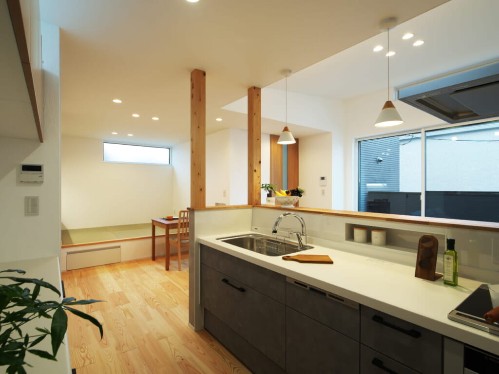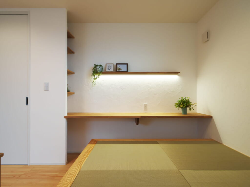 タタミダイニングとして作られた小上がりのタタミコーナーは、その一角に掘りごたつ式のカウンターを設置。子ども達の勉強や、ご家族の趣味のスペースとして使われるなど、このタタミコーナーは家のだんらんの中心になる大切な空間になっています。