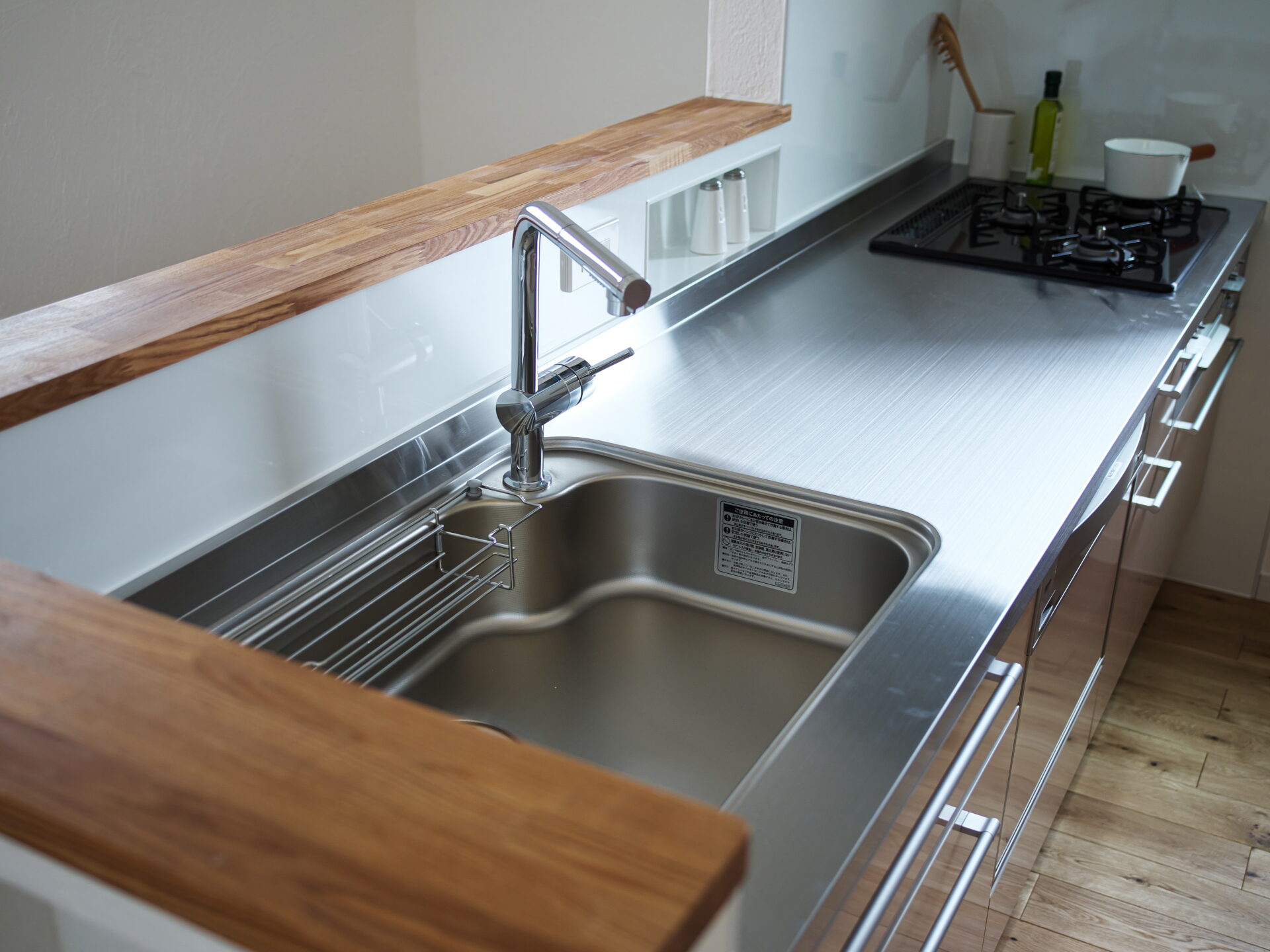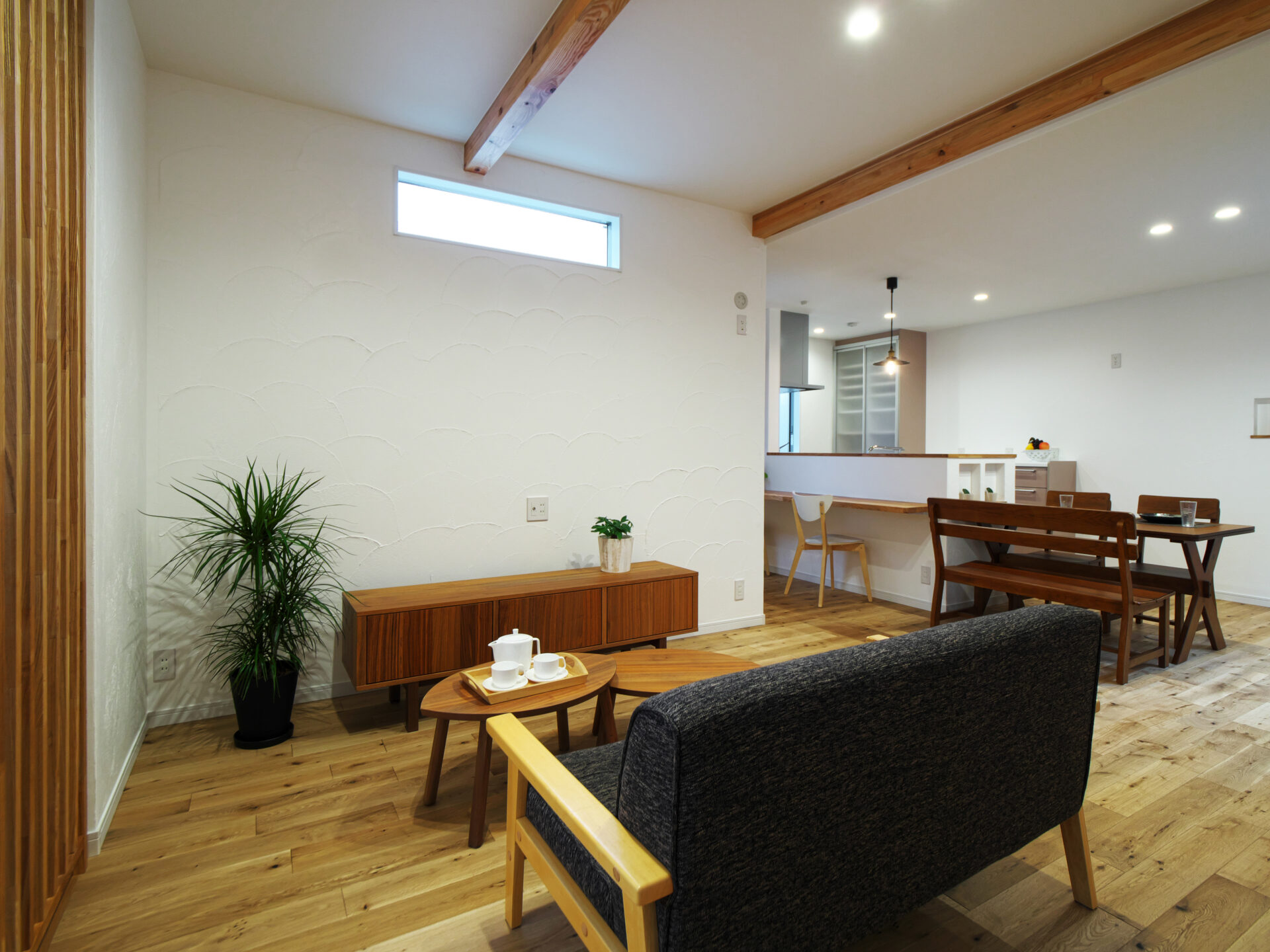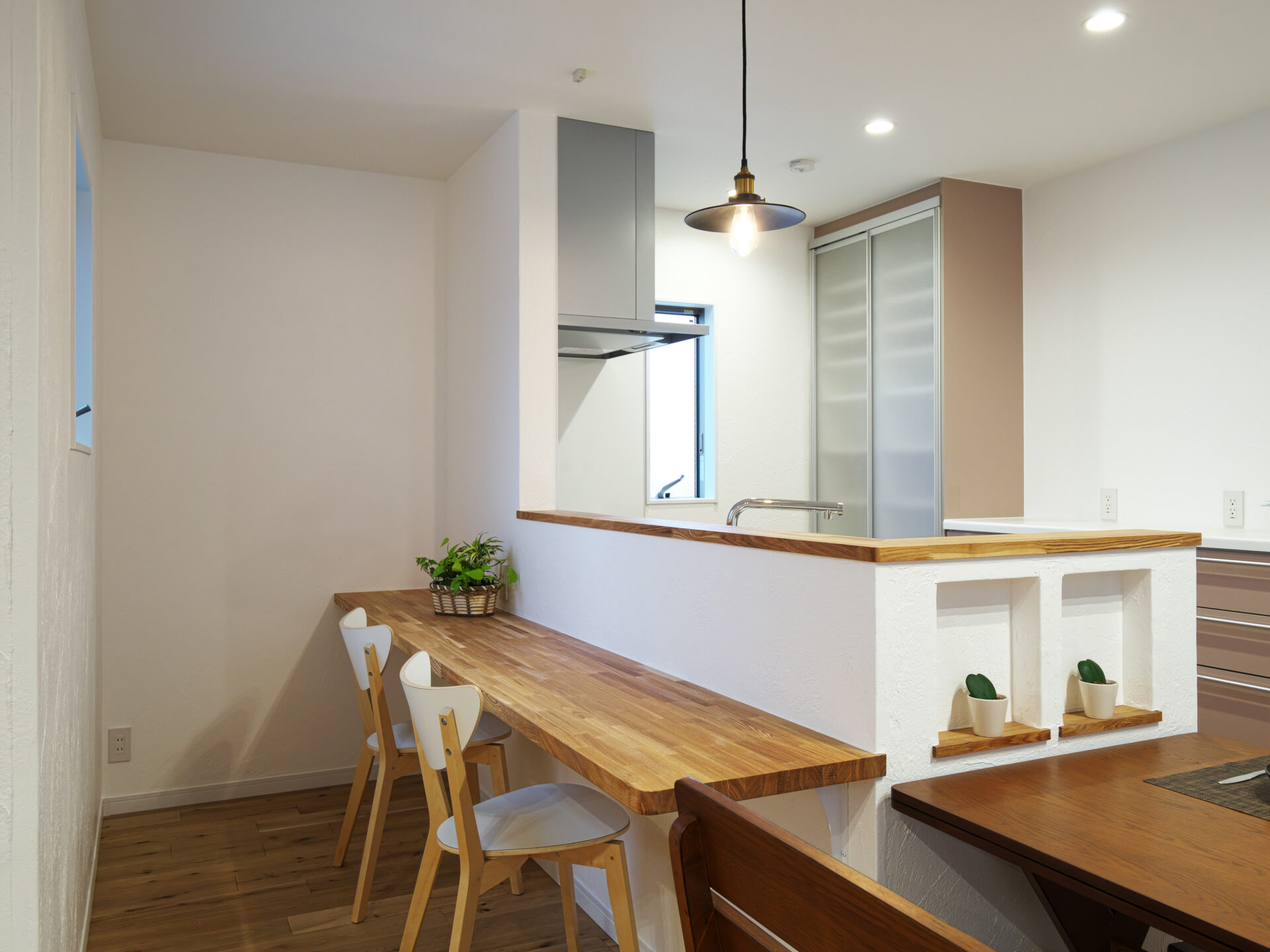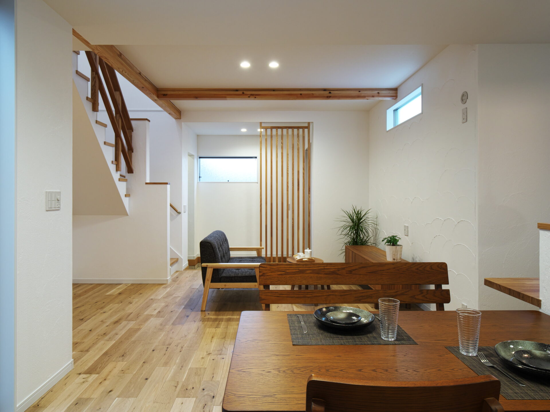 茨木市に建つこの住まいは、玄関ホールを設けず直接LDKにつなげる間取りで、限られた面積でも空間の広がりを確保しています。白×ネイビーの外観デザインに加え、構造梁を見せるナチュラルな内部デザインや木格子による視線コントロールなど細部の工夫が光ります。キッチン対面にはダイニングとつながる造作カウンターを設け、暮らしの動線とインテリア性を両立した住まいです。