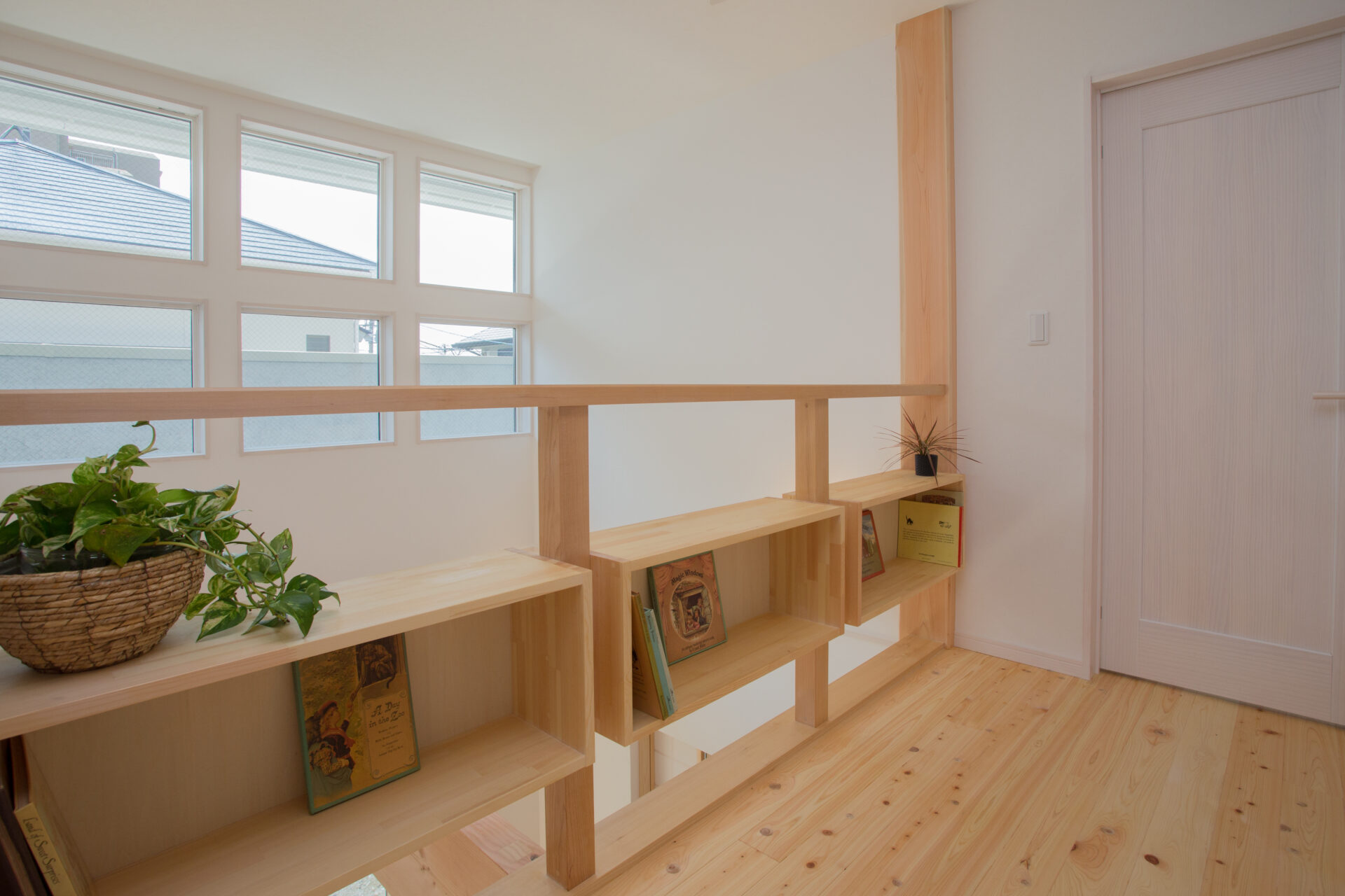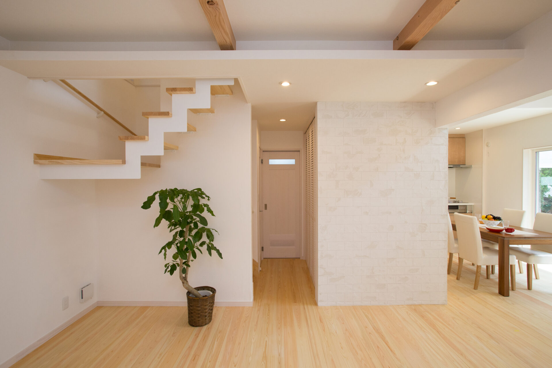 外壁はそとん壁、室内は漆喰仕上げとし、断熱にはセルロースファイバーを採用。さらにヒノキの床がやさしい足触りと木の香りを添え、素材の調湿性を活かした心地よい空気環境を実現しました。家族が健やかに暮らせる住まいです。