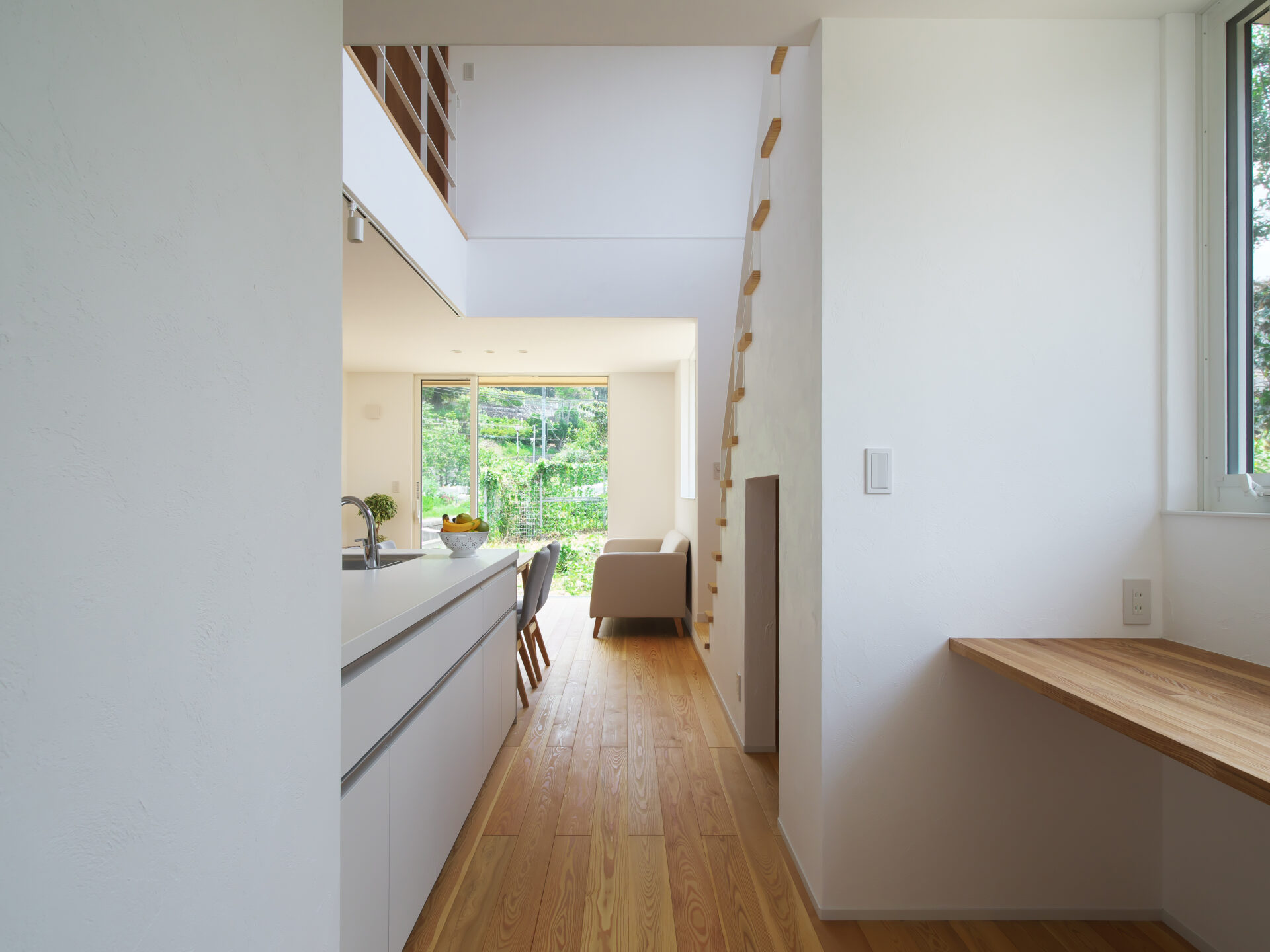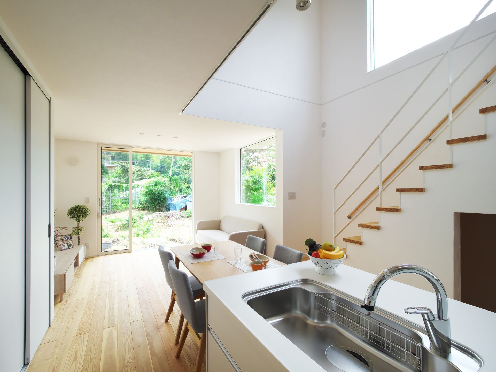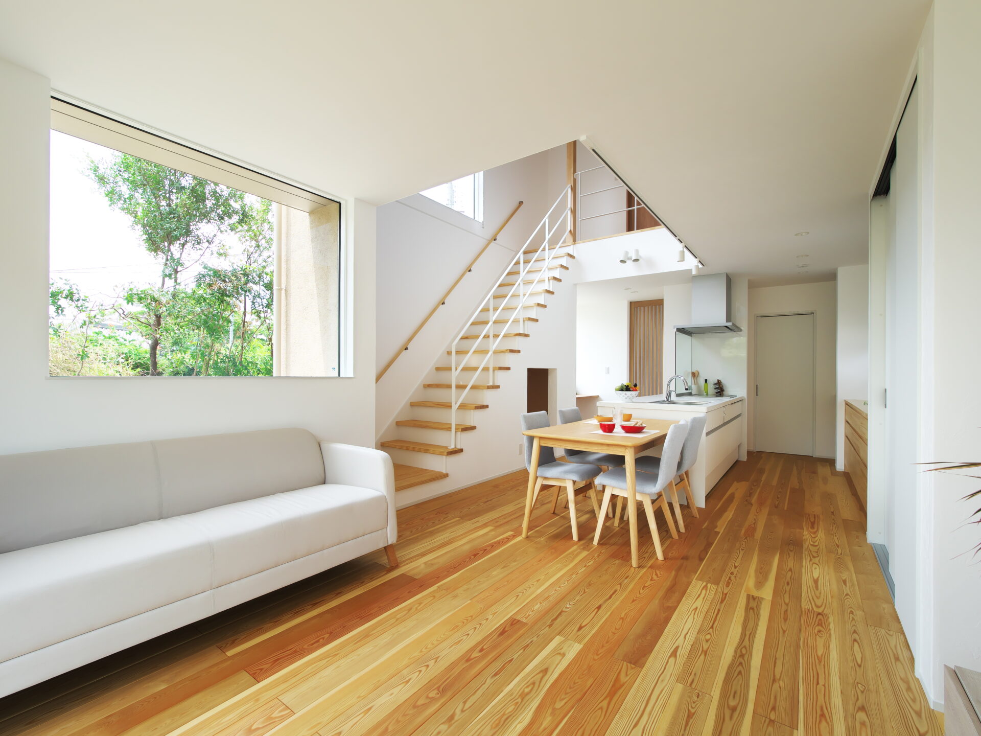 茨木市に建つ自然素材の家で、外壁にそとん壁を使いナチュラルな風合いと高級感を演出。大きなFIX窓で豊かな自然を切り取り、日中でも明るいLDKや使い勝手を考えたペニンシュラキッチン、吹き抜けで光が行き渡る空間設計が特徴です。掃き出し窓で庭とのつながりも意識し、細部にも木の質感を活かした上質で居心地のよい住まいです。