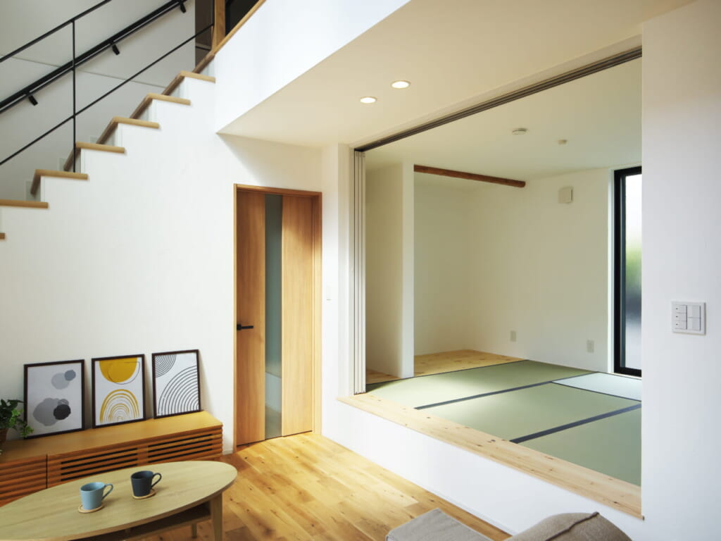 リビングと続き間となった小上がりの和室。時には客間として締め切り、時には家族が腰かける。複数の用途を持つ空間です。
