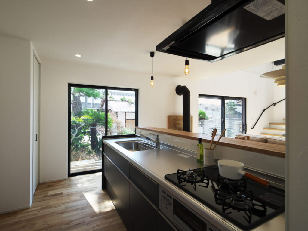 対面式のキッチンの南面にも外に出られる掃き出し窓を設けて、南側全面を庭と繋げました。
