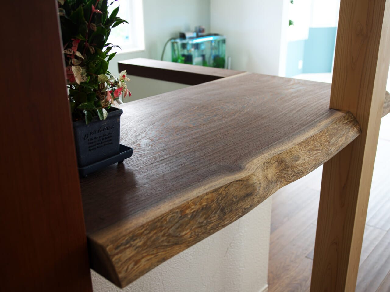 キッチンカウンターに据えられているのは無垢のウェンジ(マメ科ミレシア属)材。黒みの強いウェンジは、珍しい濃い色目をしていることや、衝撃や曲げに強い頑丈さを持つことなどから近年特に注目され始めた木材です。また、木のデコボコ部分を「ミミ」と呼ぶのですが、家具やカウンターに木の素材感を残したい際にはこの「ミミ」を残します。このカウンターもまさに「ミミ」を残したデザインに仕上がっています。
