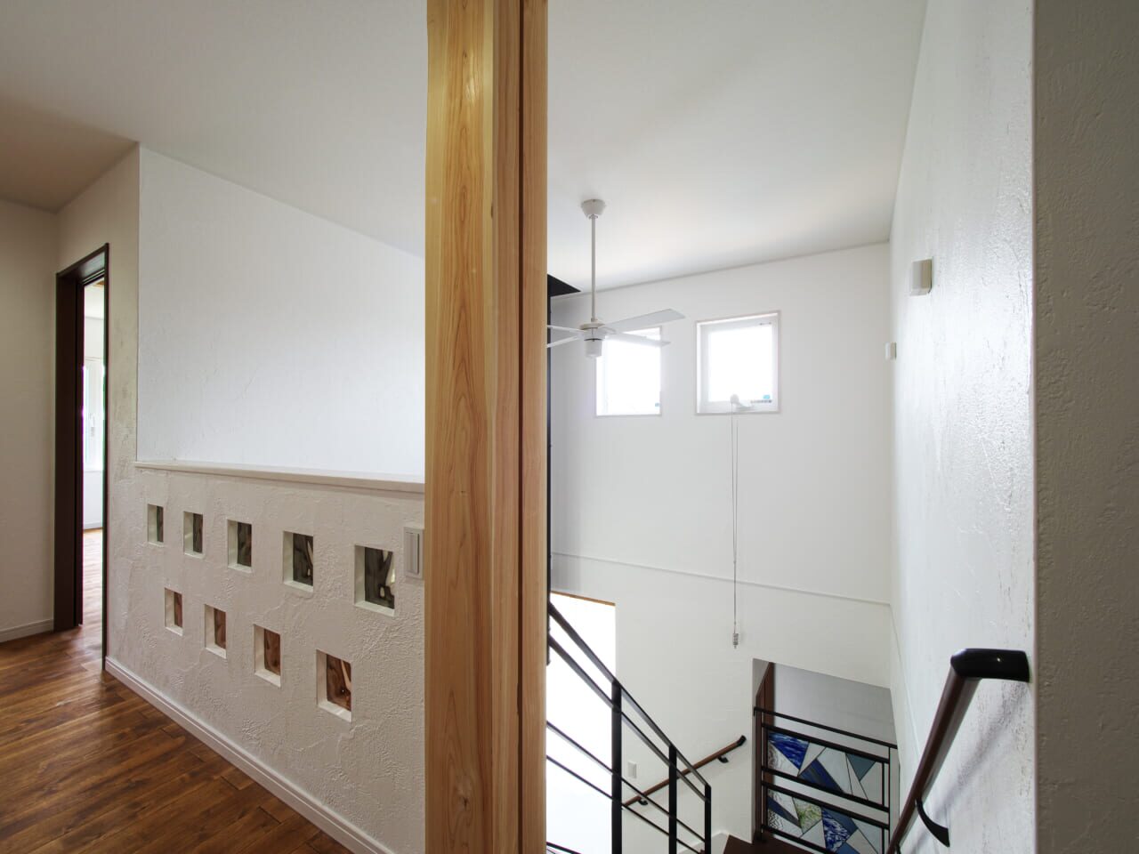 近年ではあまり見ることのなくなった「家の中心の柱」に当たる大黒柱。こちらのお住まいではその古き良き伝統的な柱もまた、家のシンボルとして採用されました。毎日通り過ぎるだけの空間を、せっかく毎日通る空間ならと、ガラスブロックなどで遊び心が効いている点も見どころの一つです。