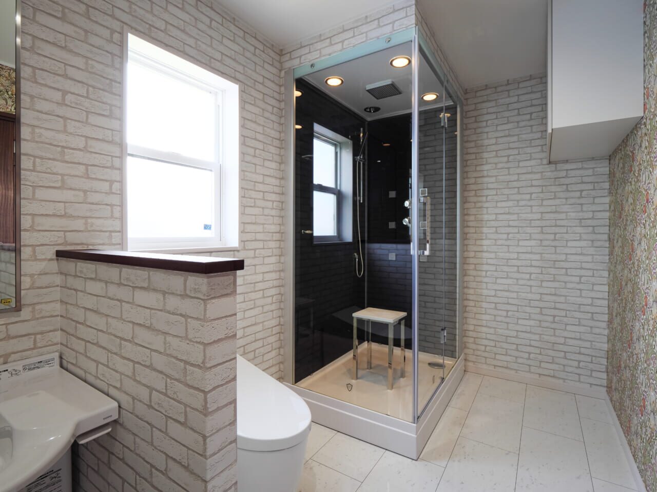 1階に一般的なシステムバスは設置していますが、2世帯住宅を想定されたこちらのお住まいでは、2階に小さなシャワーブースを別途設けました。また、トイレはバリアフリーに対応するため空間を広く取り、無駄な空間を作らない工夫が施されています。