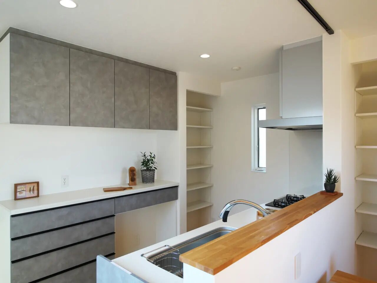 茨木市の注文住宅|2階のキッチンから景色を望む家|風景を切り取る窓と木の風合い