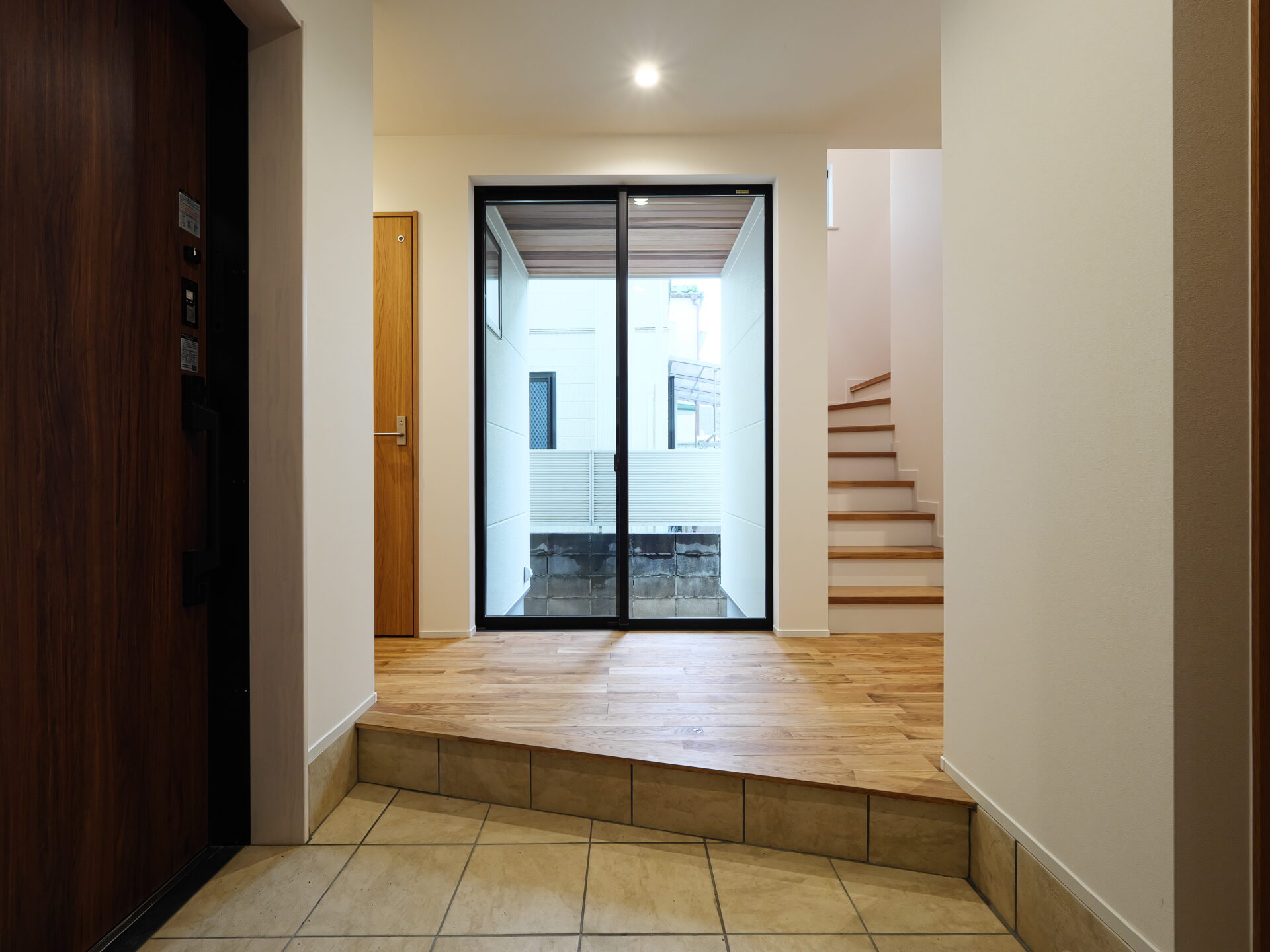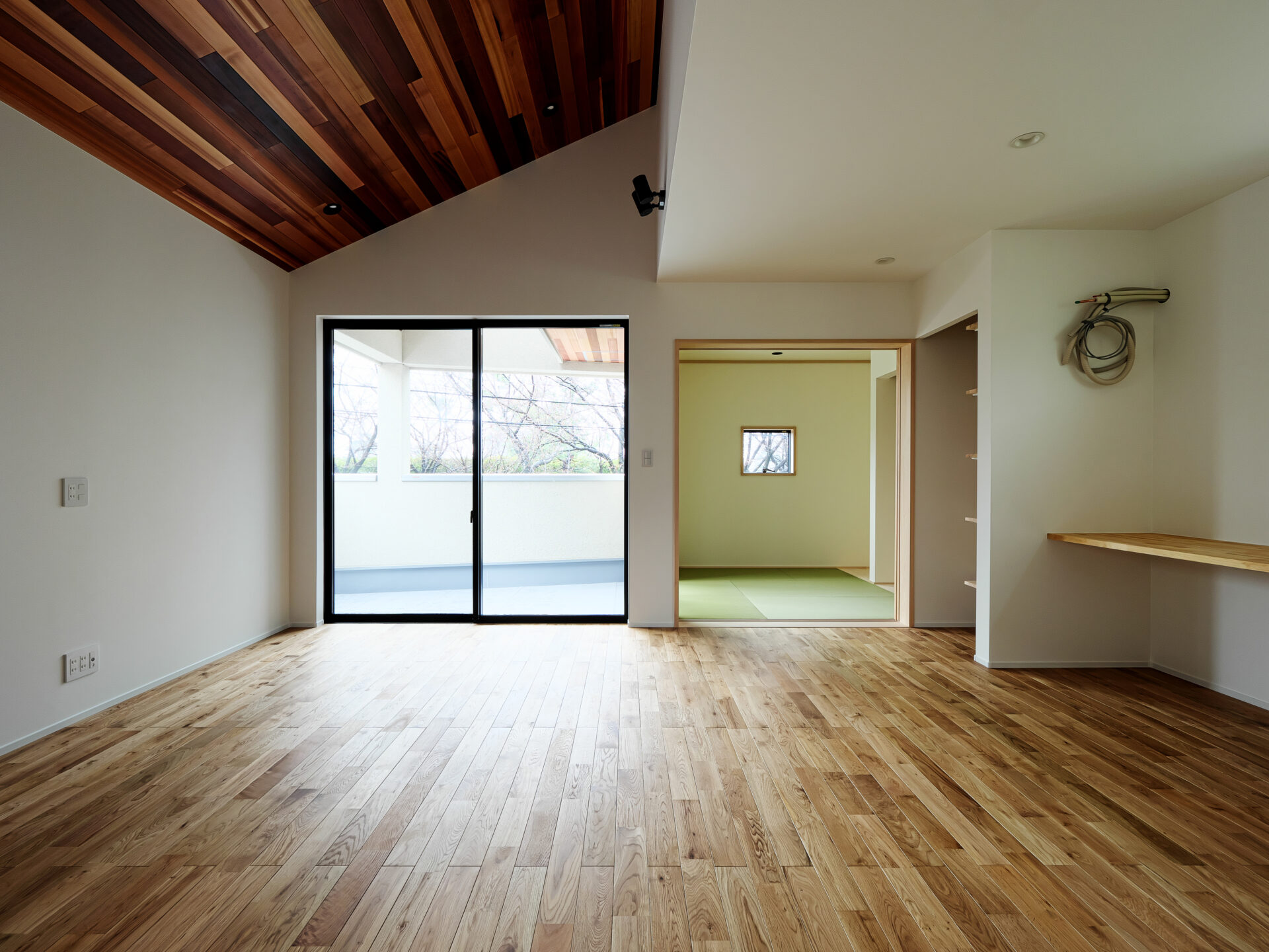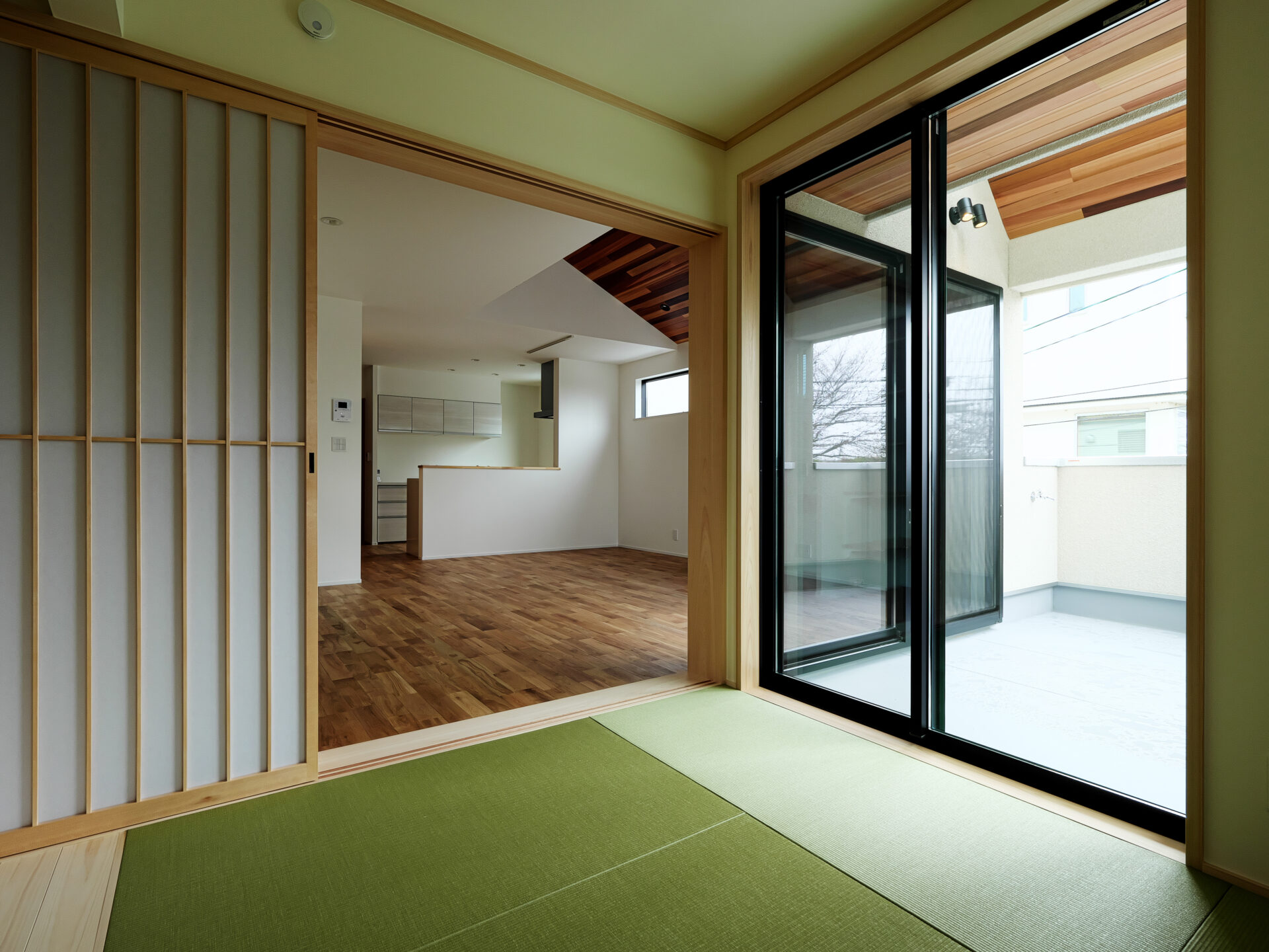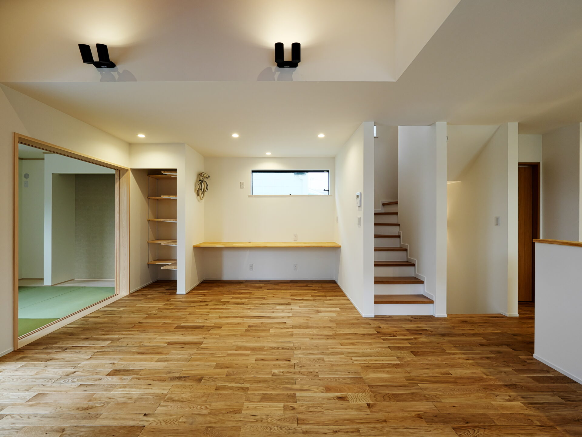この施工事例は西宮市に建つナチュラルモダンな3階建ての注文住宅で、自然素材を活かしながらモダンなデザインに仕上げた住まいです。ALC外壁をフラ目地加工で塗装仕上げのような外観にし、対面キッチンを中心に各空間がつながる開放的なプランとしました。和室には格子戸や黒枠窓で和モダンのアクセントを加え、勾配天井やルーフバルコニーで光と風を取り込む設計。ワークスペース用カウンターや洗面脱衣室の可動棚など、暮らしやすさにも配慮した住まいです。