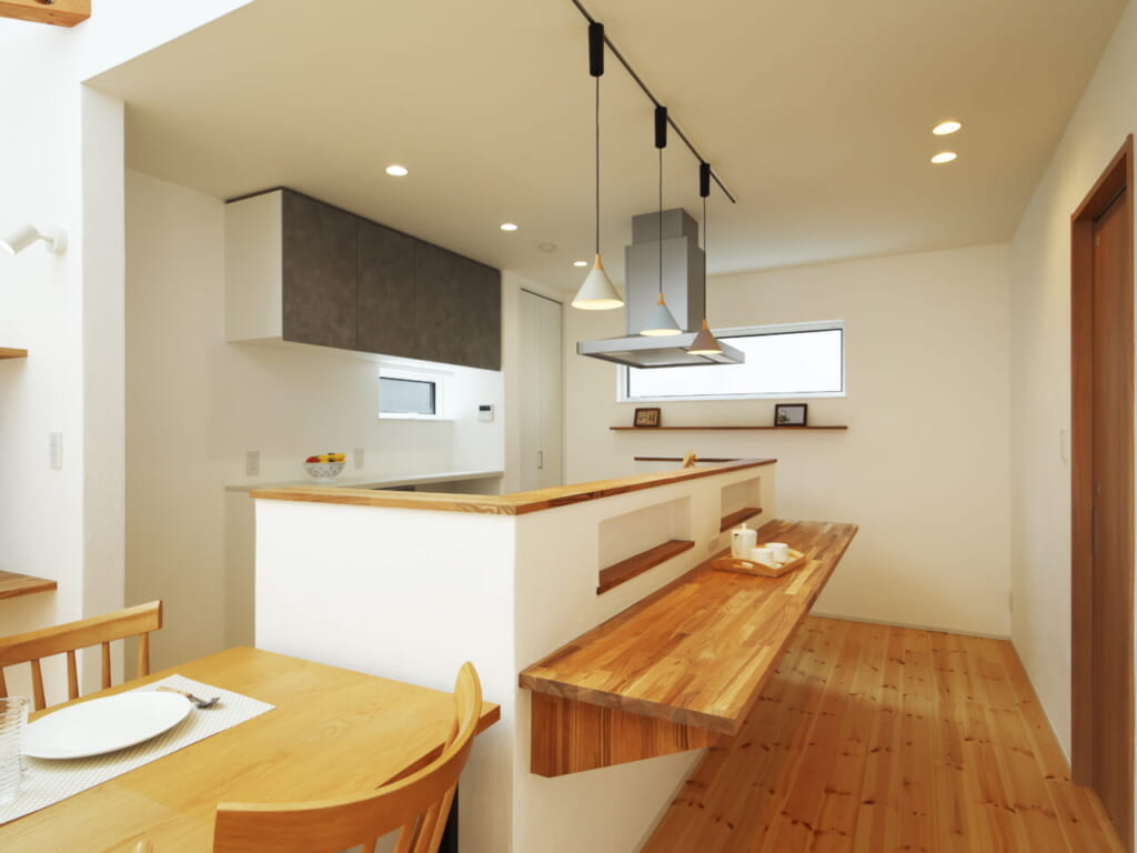 キッチンの対面には造作カウンターを設置。ダイニングと使い分けながらも同じ空間で使える用にしてあります。
