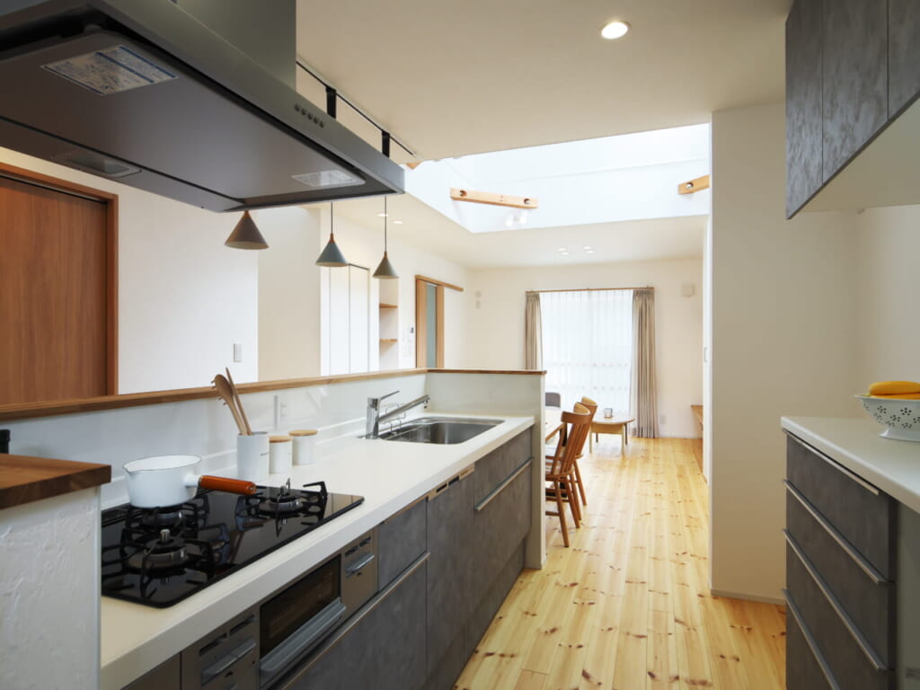 対面キッチンはLDKと並行に配置。視線が抜けやすく広く感じられることと、配膳がしやすくなるメリットがあります。
