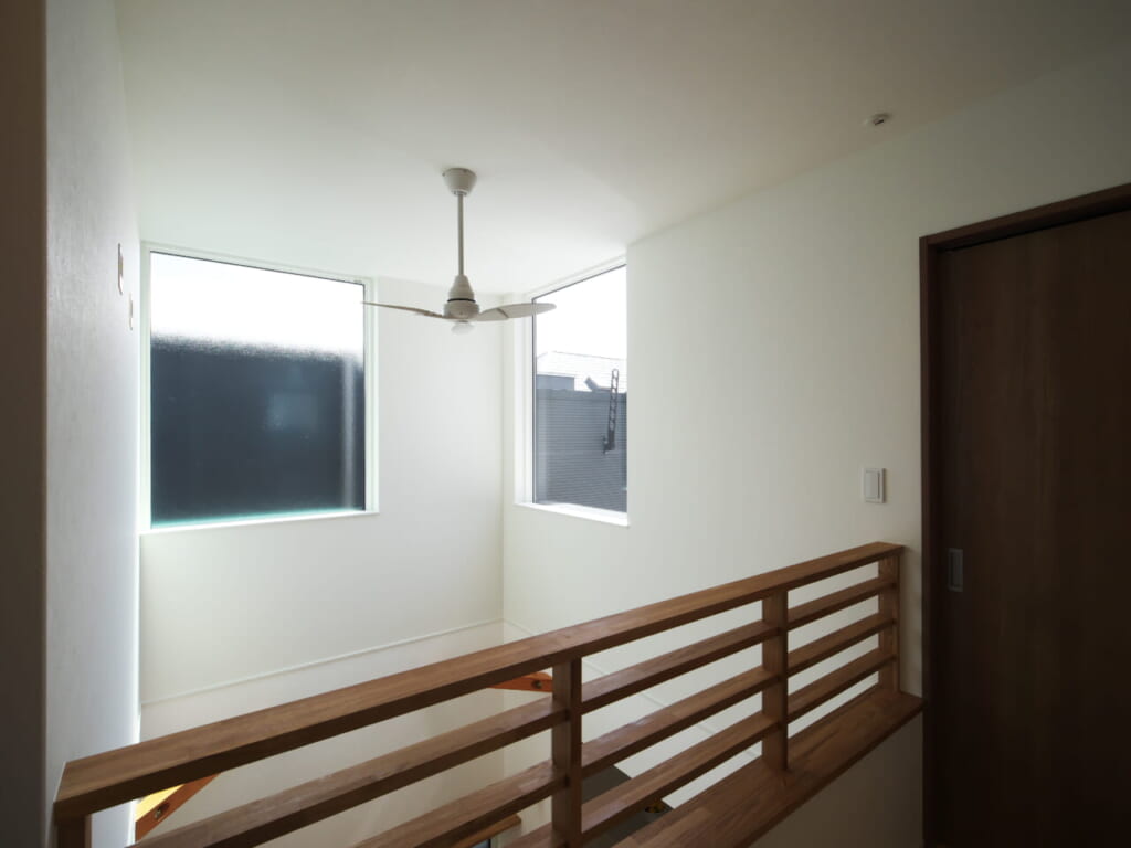 吹抜けに設けられた大きな窓。明かりを落とすことと、そして視線が外に抜けて広く感じられること。