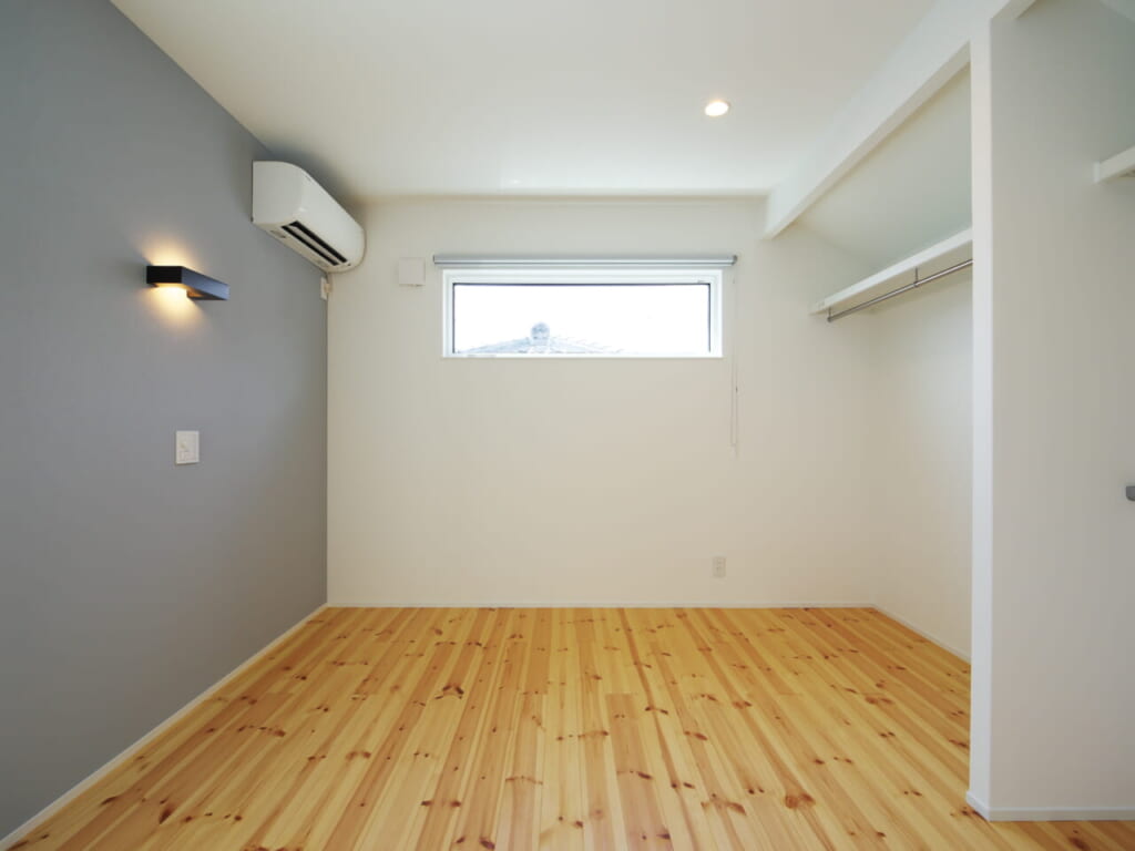 主寝室にはアクセントクロスでほんの少し遊び心も。実用面からクローゼットに扉は設置しませんでした。