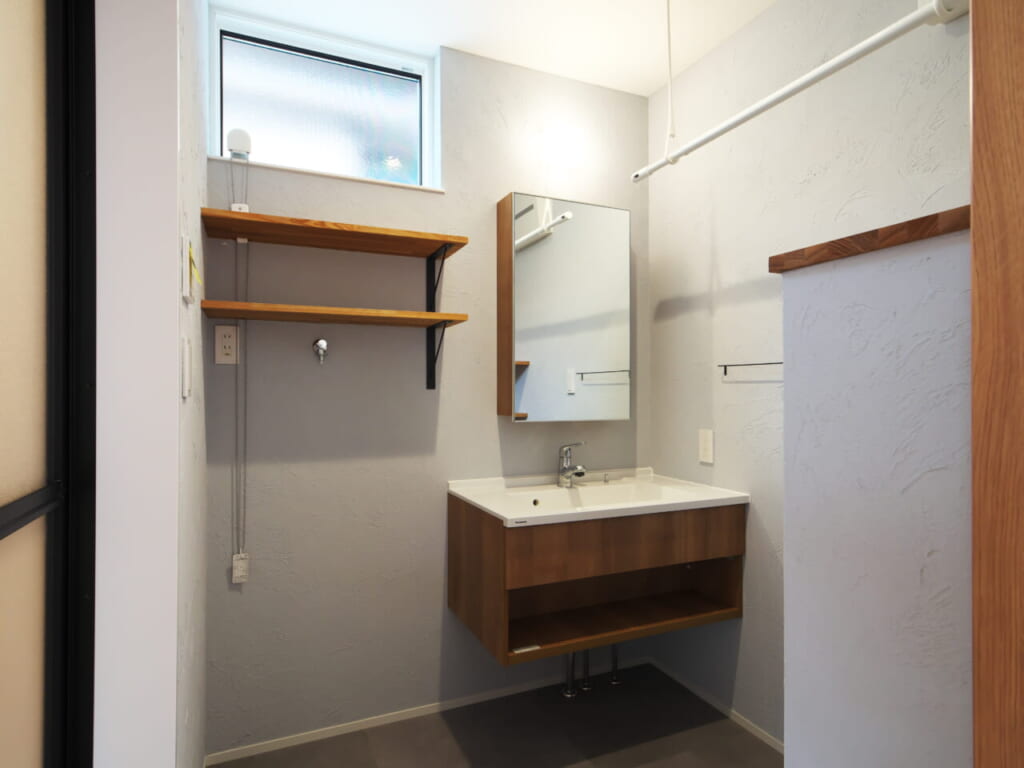 洗濯機上部のスペースも無駄なく使える用に可動棚を配置。スペースは余すことなく使います。