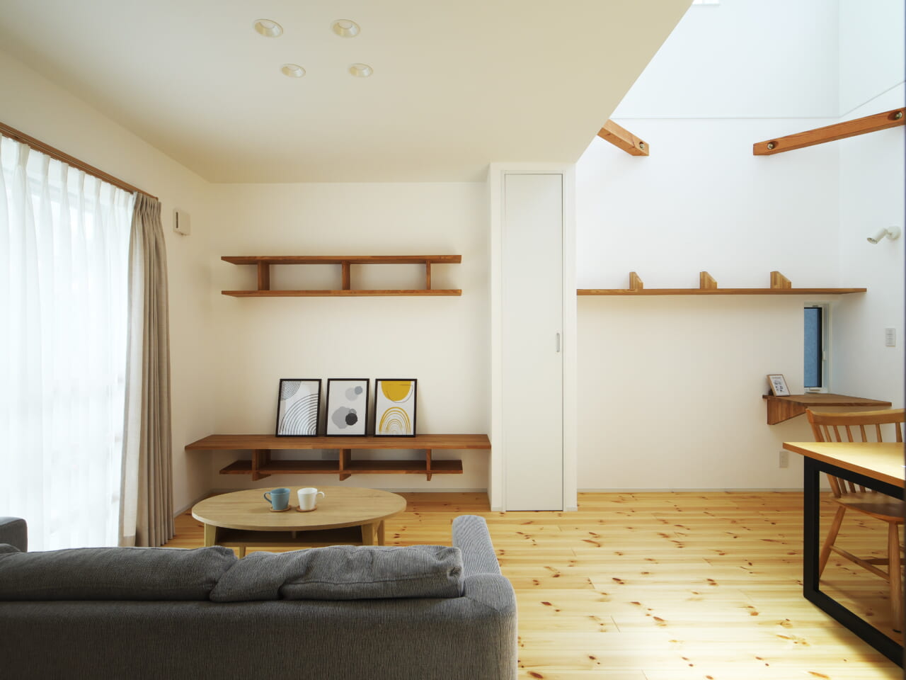 高槻市の注文住宅|開放感のある25坪の住まい|吹抜けの光が無垢のパインを照らす